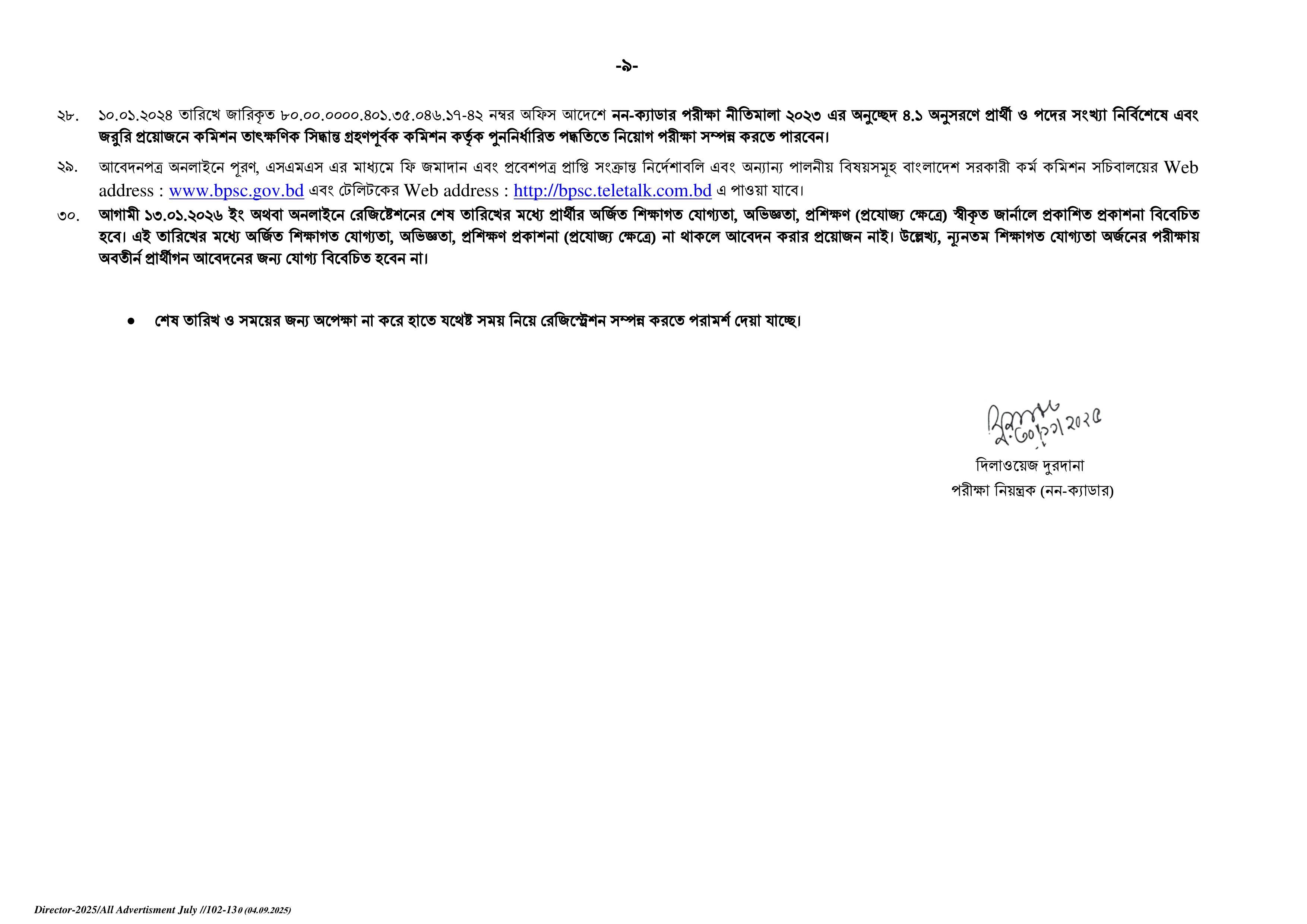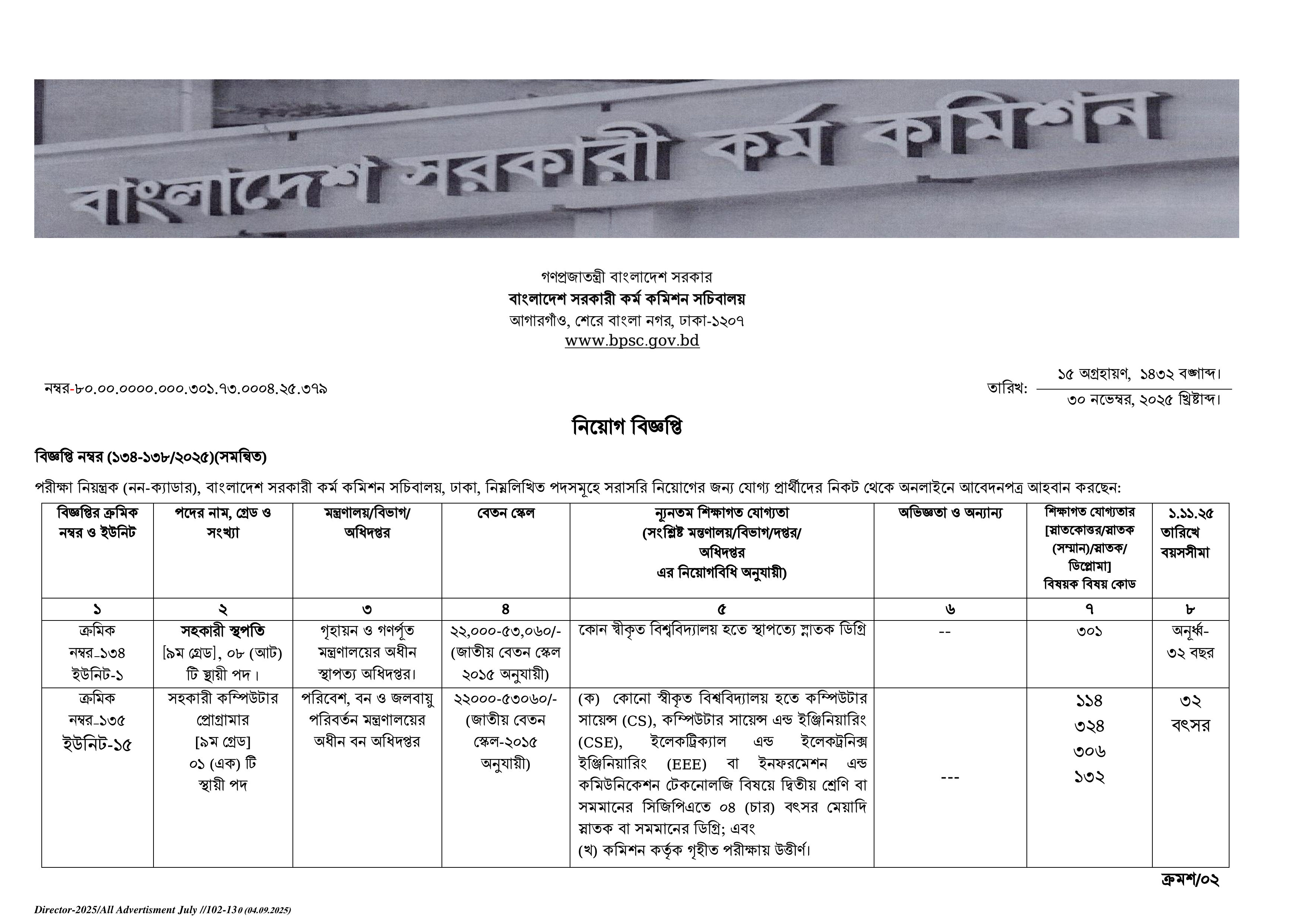 বাংলাদেশ সরকারী কর্ম কমিশন (BPSC) ২০২৫ সালের নন-ক্যাডার পদে নতুন নিয়োগ বিজ্ঞপ্তি প্রকাশ করেছে। এই বিজ্ঞপ্তির মাধ্যমে সর্বমোট ২৪টি স্থায়ী পদে জনবল নিয়োগ করা হবে। আগ্রহী ও যোগ্য প্রার্থীরা অনলাইনে আবেদন করতে পারবেন।
