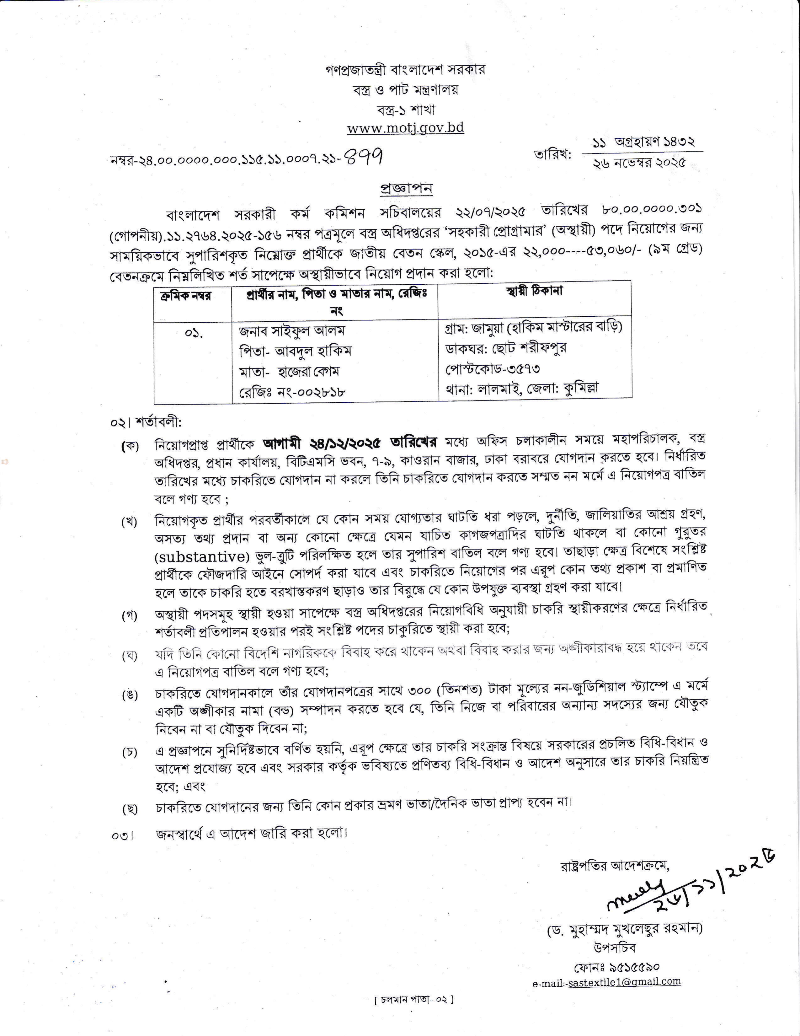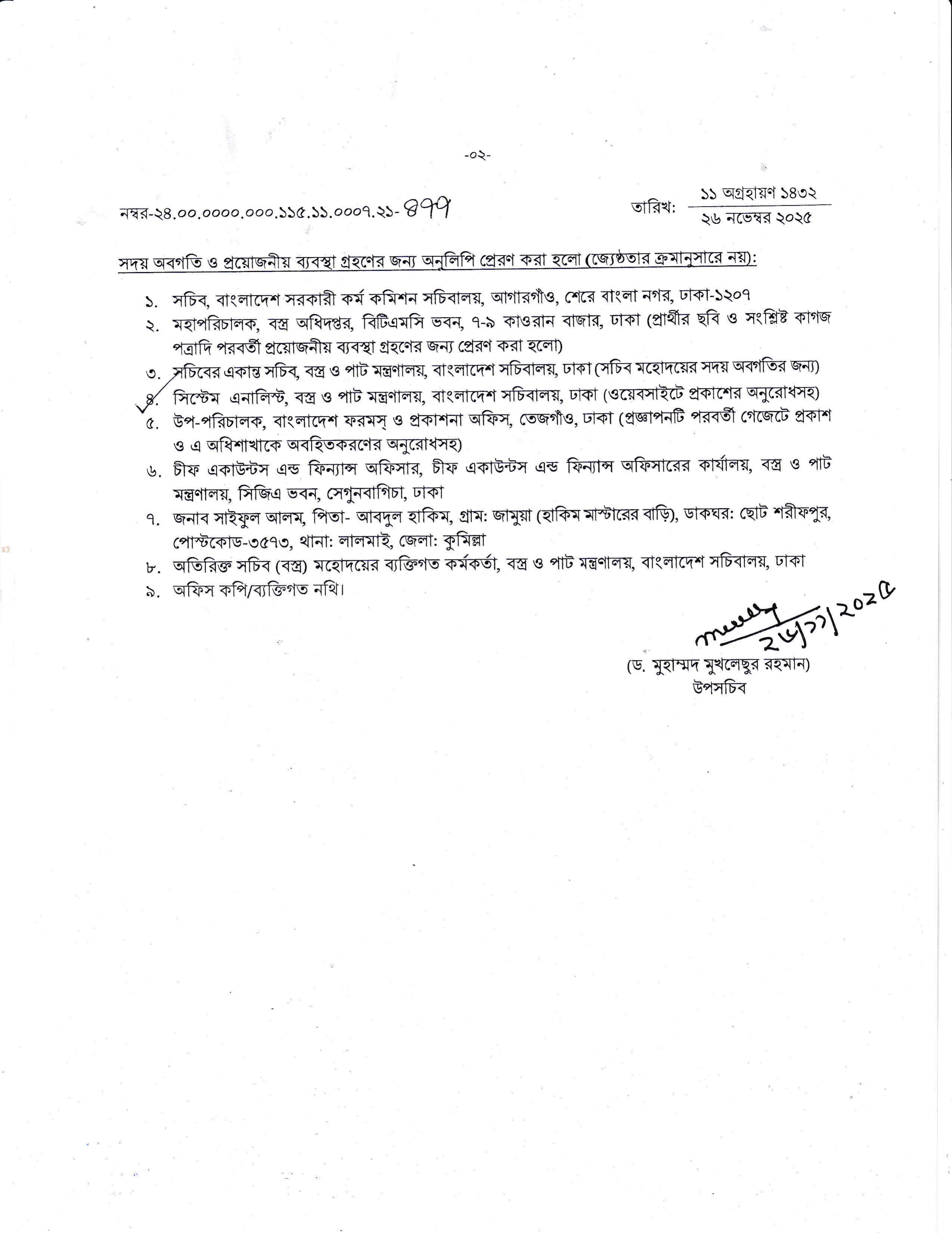 নিয়োগপ্রাপ্ত প্রার্থীকে ২৪/১২/২০২৫ তারিখের মধ্যে মহাপরিচালক, বস্ত্র অধিদপ্তর, প্রধান কার্যালয়, বিটিএমসি ভবন, ৭-৯, কাওরান বাজার, ঢাকা বরাবর যোগদান করতে হবে। নির্ধারিত তারিখের মধ্যে যোগদান না করলে নিয়োগপত্র বাতিল বলে গণ্য হবে।