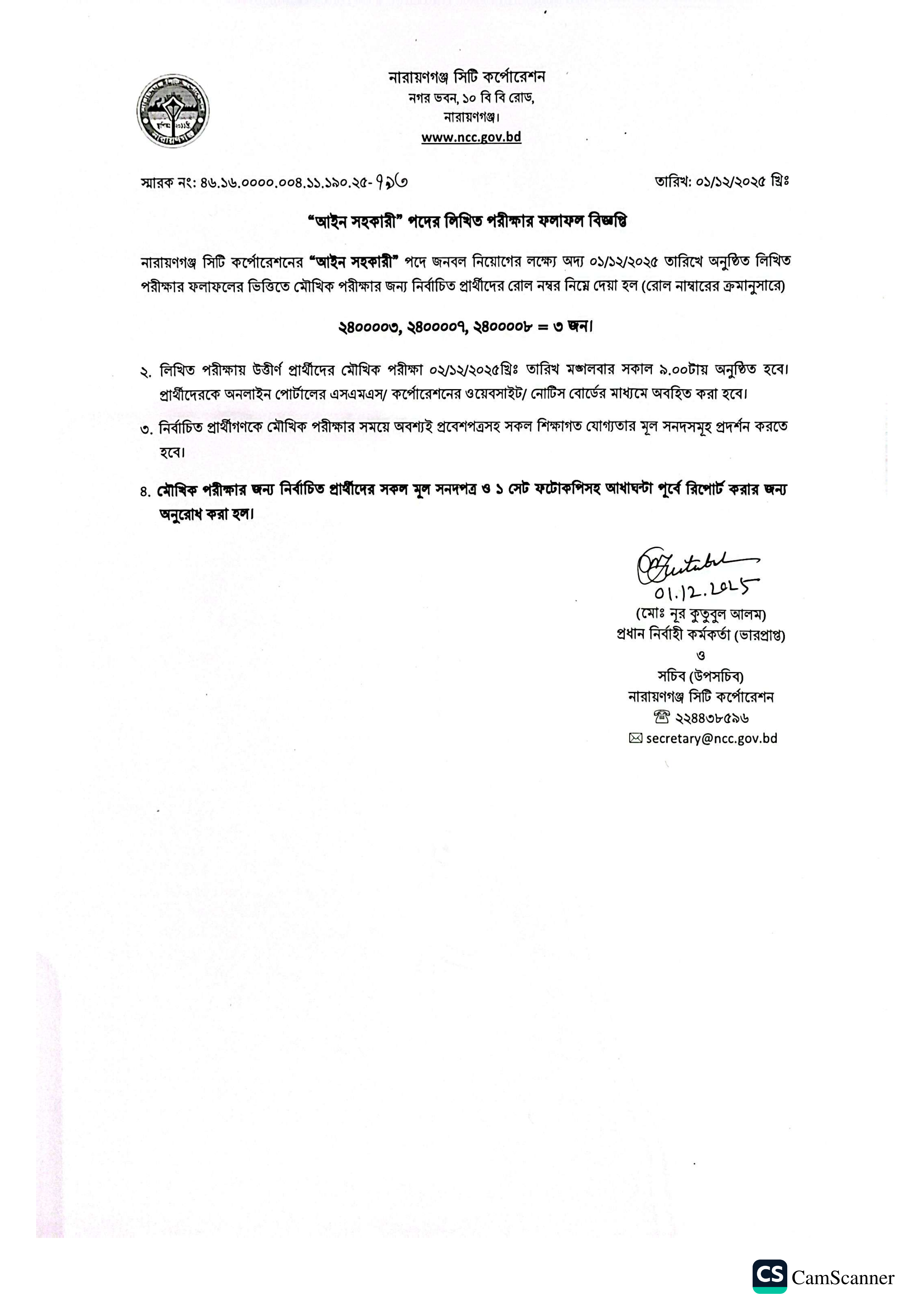 নারায়ণগঞ্জ সিটি কর্পোরেশনের “আইন সহকারী” পদে জনবল নিয়োগের লক্ষ্যে অনুষ্ঠিত লিখিত পরীক্ষার ফলাফল প্রকাশিত হয়েছে।