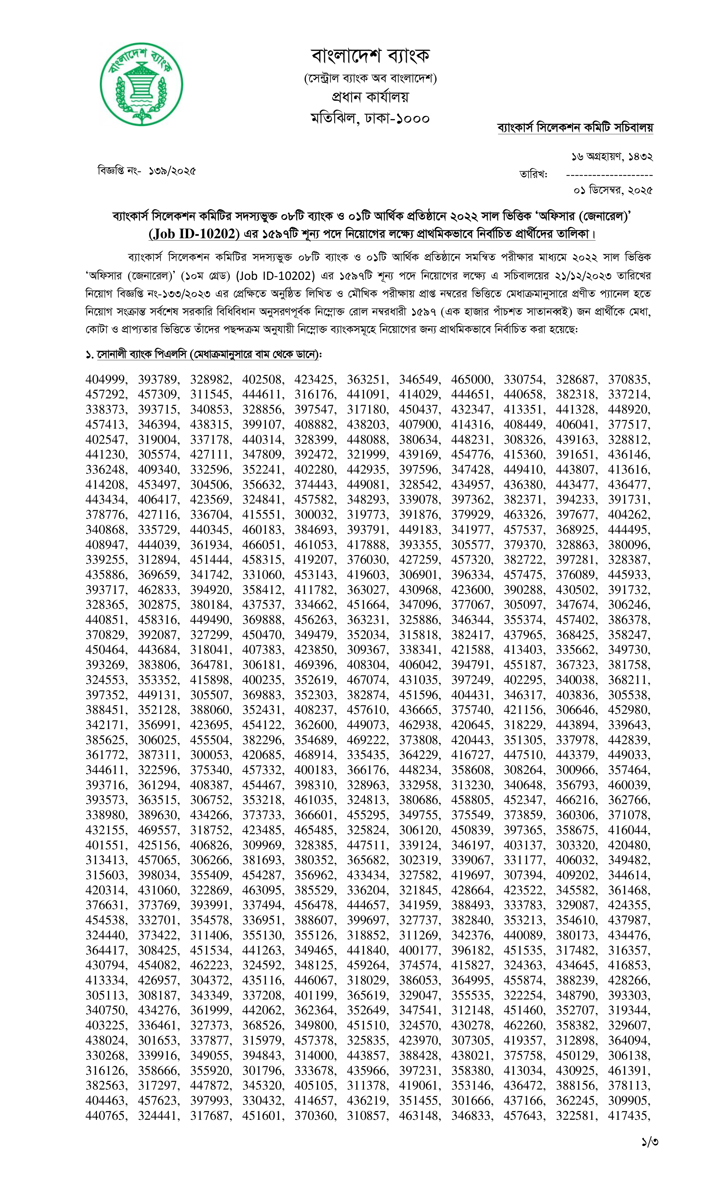 মোট ১৫৯৭ জন প্রার্থীকে প্রাথমিকভাবে নির্বাচিত করা হয়েছে। নিয়োগ সংক্রান্ত পরবর্তী সকল কার্যক্রম সংশ্লিষ্ট ব্যাংক কর্তৃক সম্পাদিত হবে।