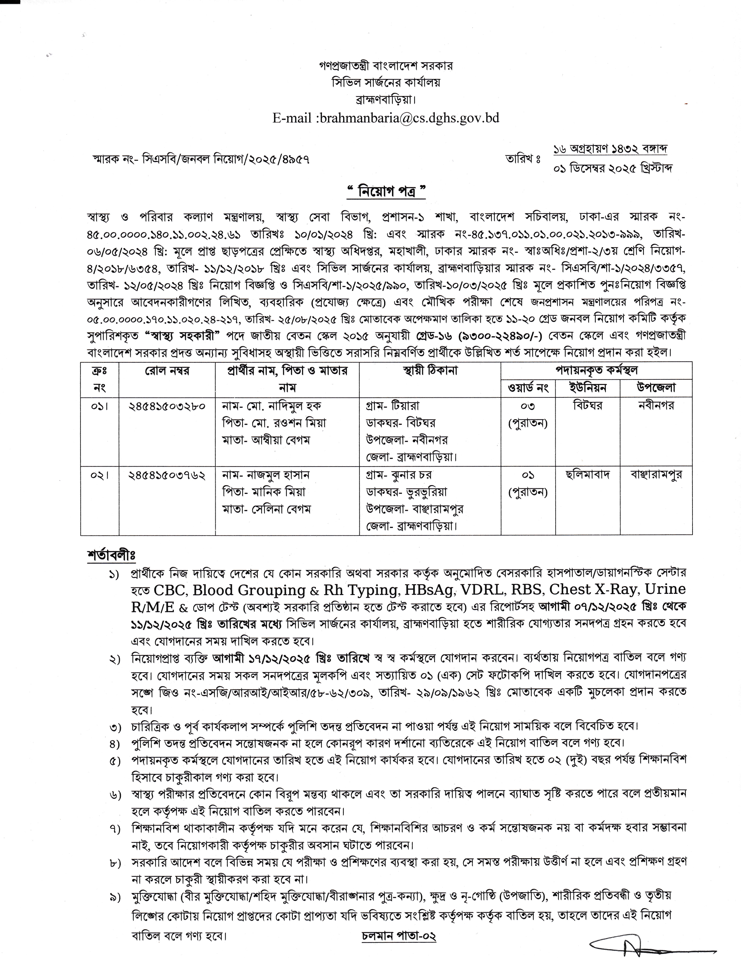 সিভিল সার্জনের কার্যালয়, ব্রাহ্মণবাড়িয়া কর্তৃক “স্বাস্থ্য সহকারী” পদে নিয়োগ পত্র প্রকাশ করা হয়েছে। স্বাস্থ্য ও পরিবার কল্যাণ মন্ত্রণালয়ের ছাড়পত্রের প্রেক্ষিতে এবং পূর্বের নিয়োগ বিজ্ঞপ্তি (স্মারক নং- সিএসবি/শা-১/২০২৪/৩৩৫৭, তারিখ- ১২/০৫/২০২৪ এবং পুনঃনিয়োগ বিজ্ঞপ্তি সিএসবি/শা-১/২০২৫/৯৯০, তারিখ-১০/০৩/২০২৫) অনুযায়ী আবেদনকারীদের লিখিত, ব্যবহারিক ও মৌখিক পরীক্ষা শেষে অপেক্ষমাণ তালিকা থেকে এই অস্থায়ী ভিত্তিতে নিয়োগ প্রদান করা হয়েছে।