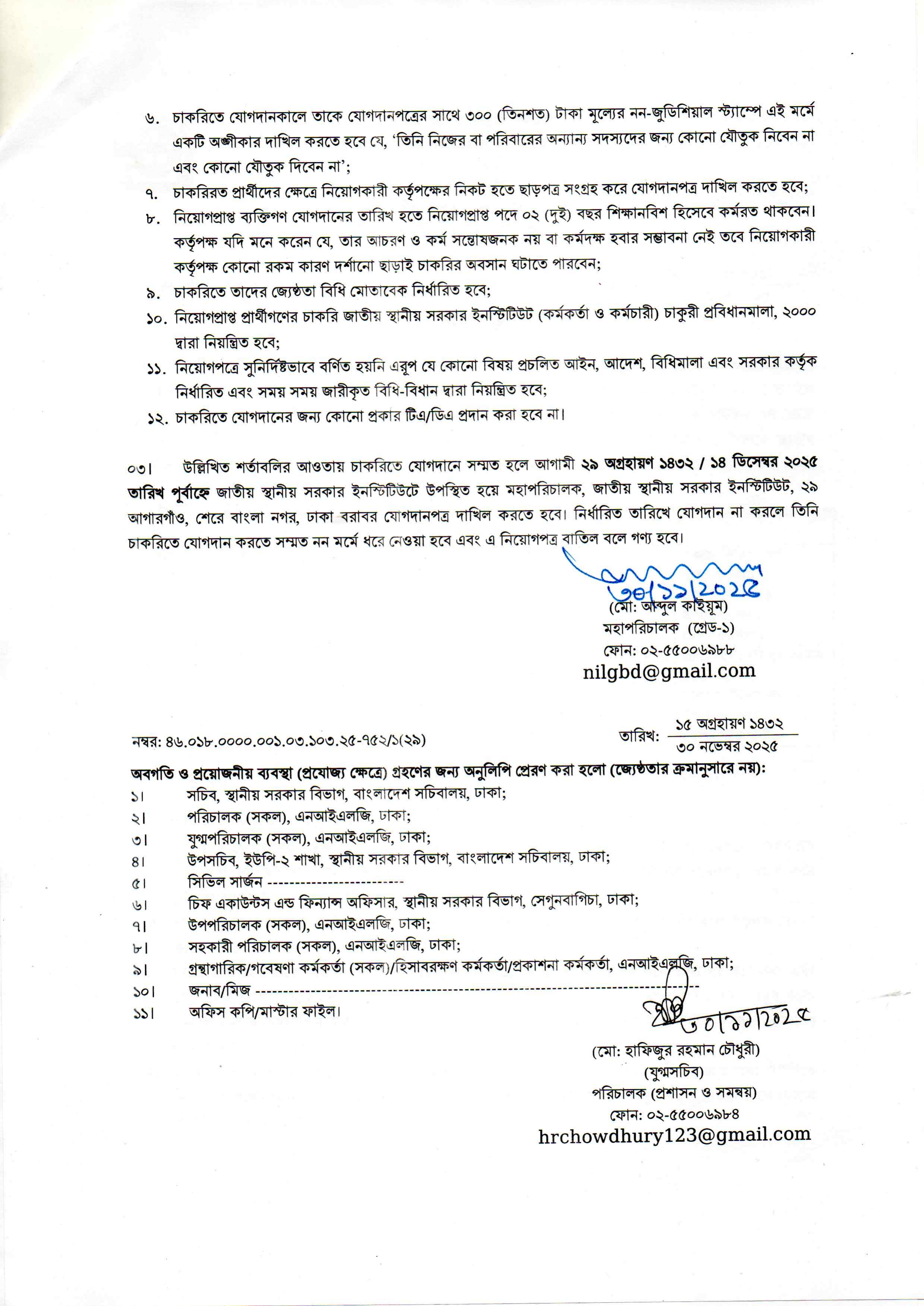 যোগদানের শেষ তারিখ: আগ্রহী প্রার্থীদের আগামী ১৪ ডিসেম্বর ২০২৫ তারিখ (২৯ অগ্রহায়ণ ১৪৩২) পূর্বাহ্নের মধ্যে জাতীয় স্থানীয় সরকার ইনস্টিটিউট, ২৯, আগারগাঁও, শেরে বাংলা নগর, ঢাকা-১২০৭ এ উপস্থিত হয়ে মহাপরিচালক বরাবর যোগদানপত্র দাখিল করতে হবে।