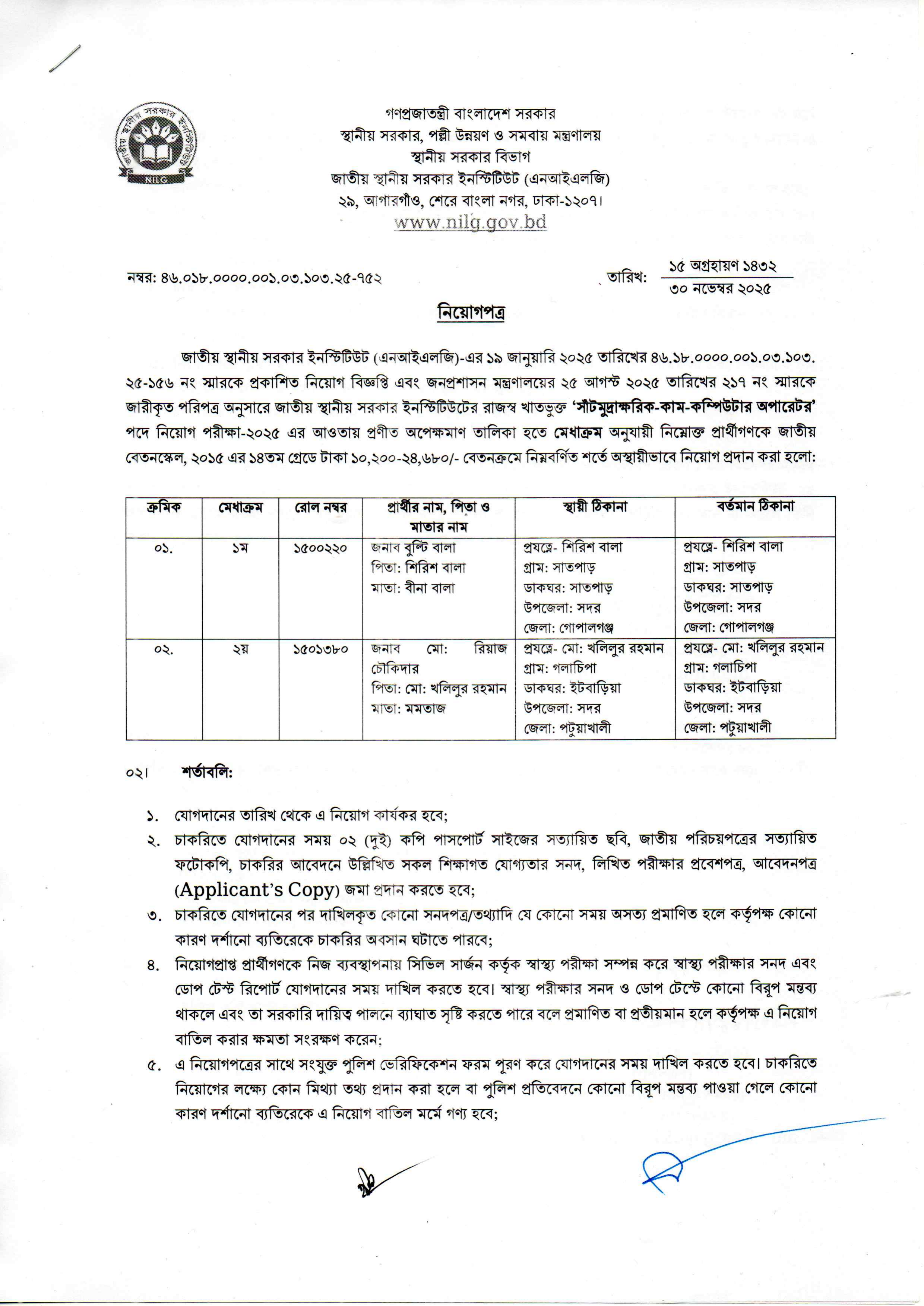জাতীয় স্থানীয় সরকার ইনস্টিটিউট (এনআইএলজি)-এর রাজস্ব খাতভুক্ত 'সাঁটমুদ্রাক্ষরিক-কাম-কম্পিউটার অপারেটর' পদে নিয়োগ পরীক্ষা-২০২৫ এর আওতায় প্রণীত অপেক্ষমাণ তালিকা হতে মেধাক্রম অনুযায়ী নির্বাচিত প্রার্থীগণকে অস্থায়ীভাবে নিয়োগ প্রদান করা হয়েছে।