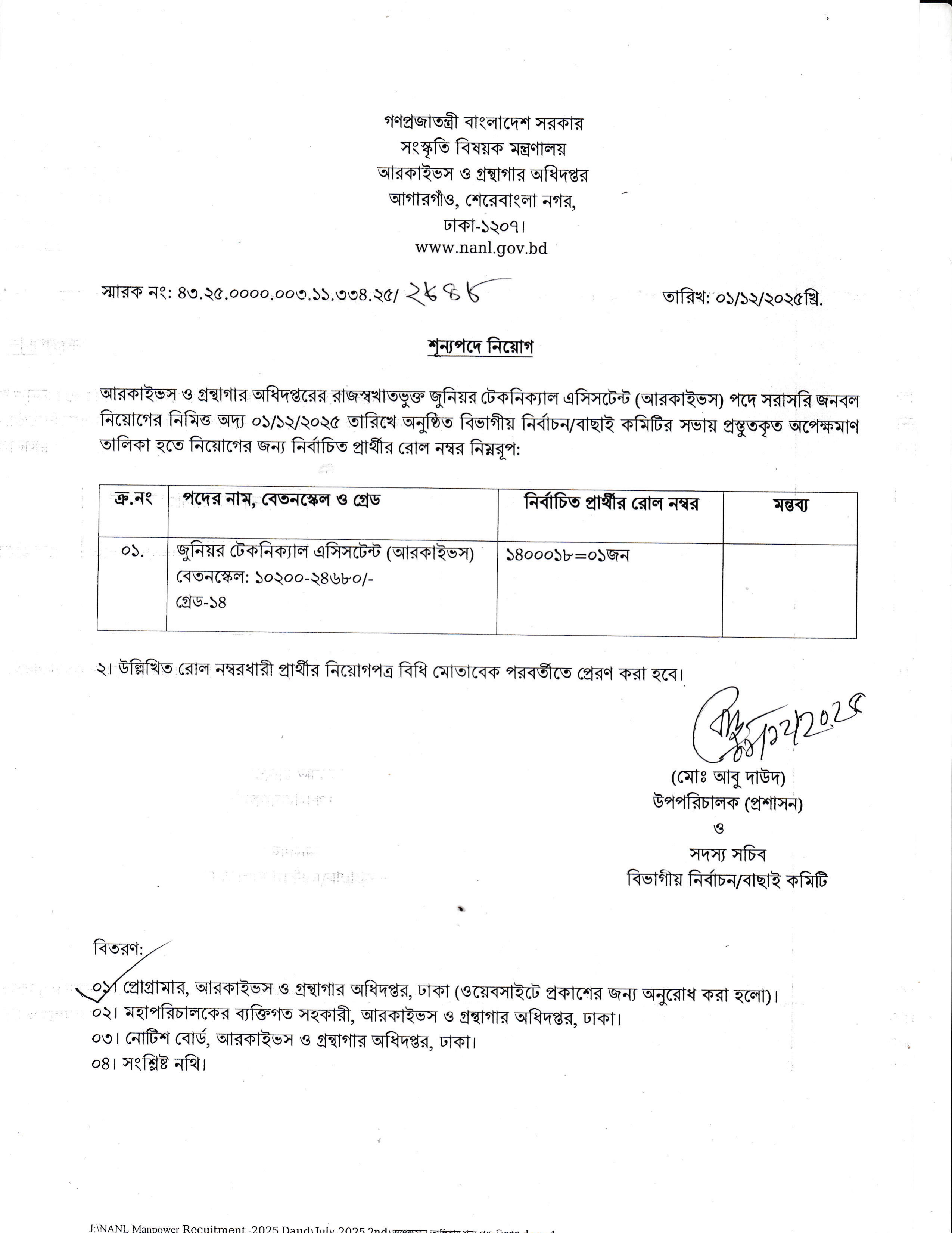 সংস্কৃতি বিষয়ক মন্ত্রণালয়ের অধীন আরকাইভস ও গ্রন্থাগার অধিদপ্তরের রাজস্বখাতভুক্ত জুনিয়র টেকনিক্যাল এসিসটেন্ট (আরকাইভস) পদে সরাসরি জনবল নিয়োগের জন্য নির্বাচিত প্রার্থীর তালিকা প্রকাশ করা হয়েছে।