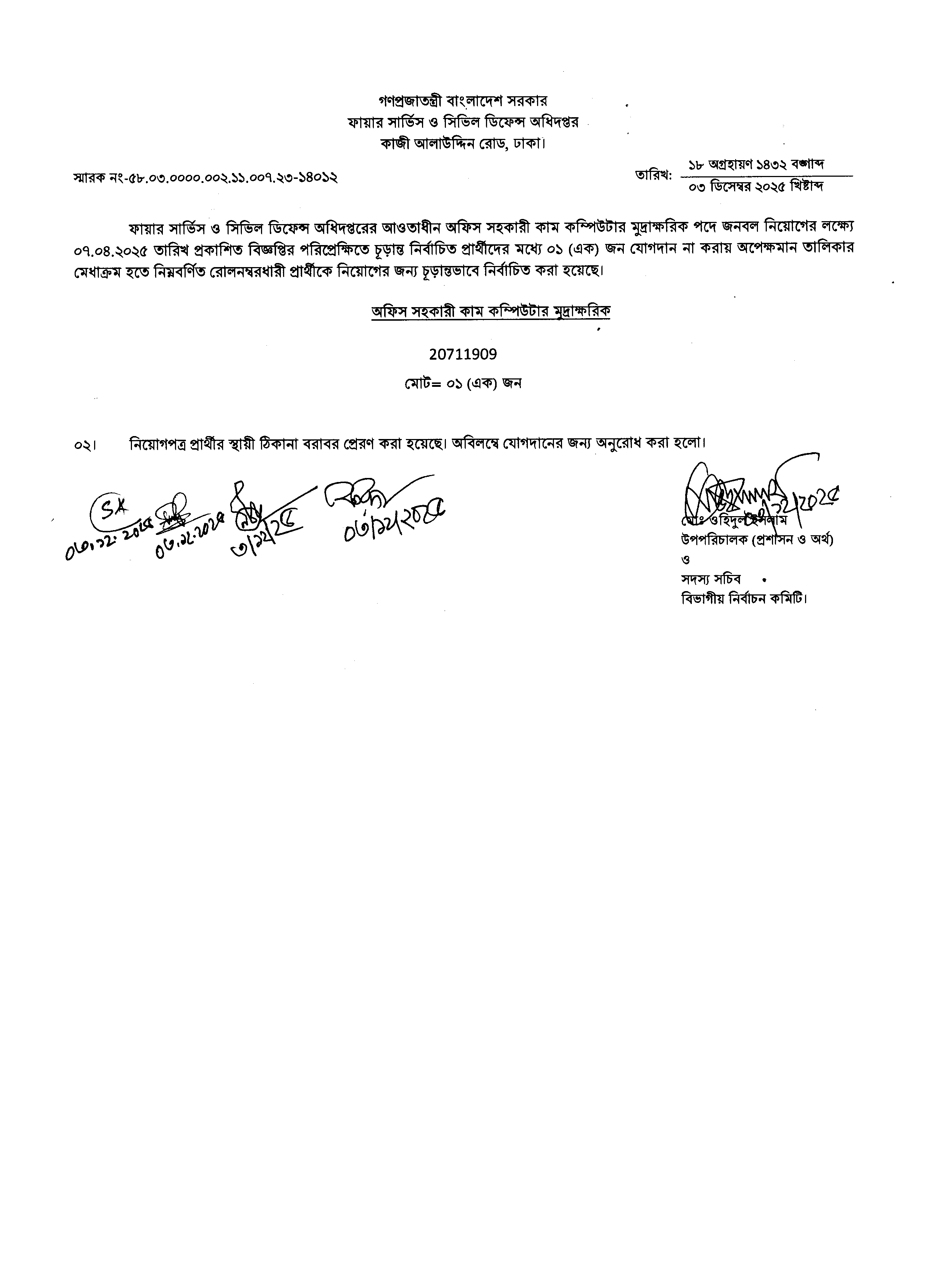 ফায়ার সার্ভিস ও সিভিল ডিফেন্স অধিদপ্তরের আওতাধীন অফিস সহকারী কাম কম্পিউটার মুদ্রাক্ষরিক পদে জনবল নিয়োগের লক্ষ্যে প্রকাশিত বিজ্ঞপ্তির পরিপ্রেক্ষিতে চূড়ান্ত নির্বাচিত প্রার্থীর যোগদান না করায়, অপেক্ষমান তালিকার মেধাক্রম হতে ১ (এক) জন প্রার্থীকে নিয়োগের জন্য চূড়ান্তভাবে নির্বাচিত করা হয়েছে।