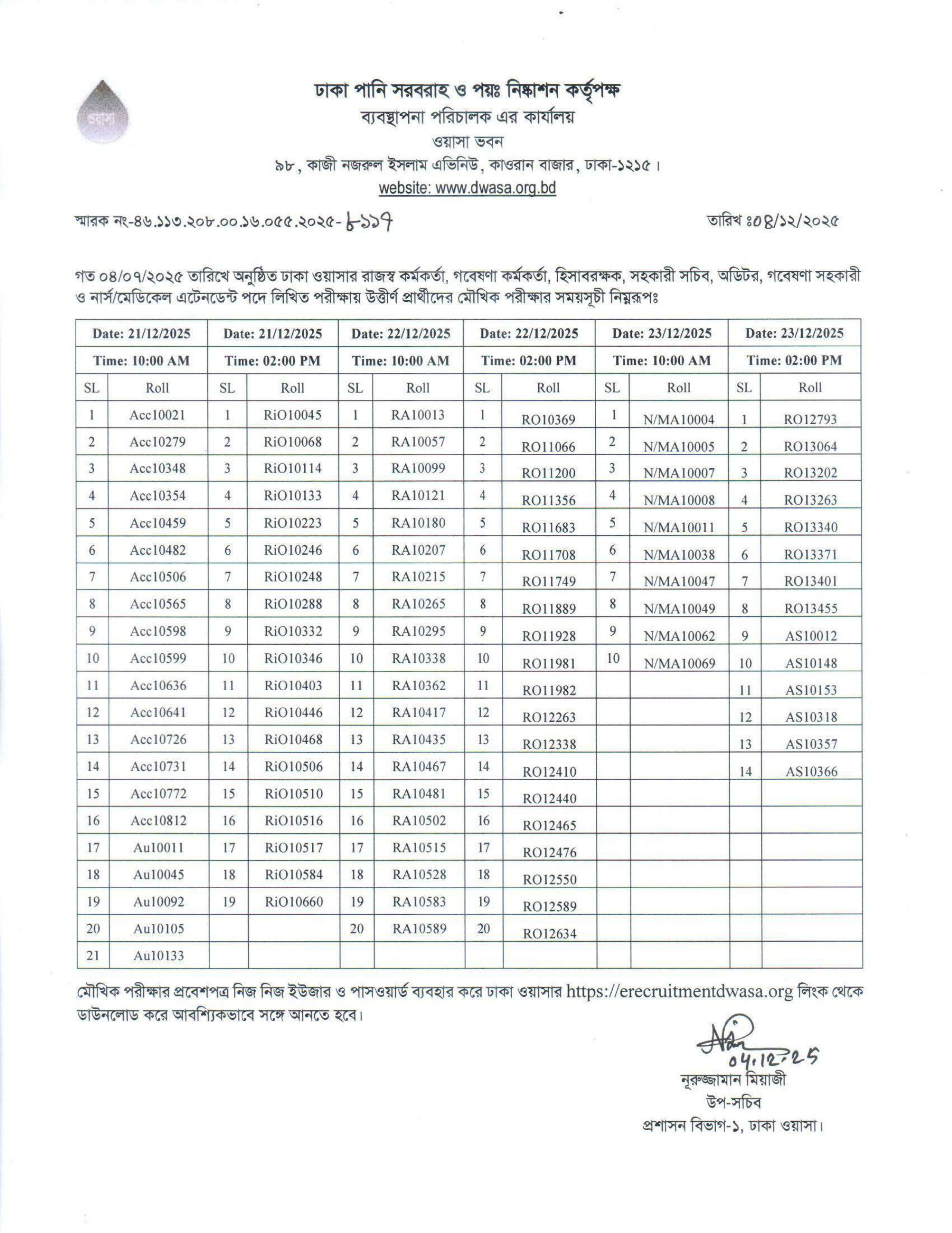 ঢাকা পানি সরবরাহ ও পয়ঃ নিষ্কাশন কর্তৃপক্ষ (ঢাকা ওয়াসা) গত ০৪/০৭/২০২৫ তারিখে অনুষ্ঠিত বিভিন্ন পদের লিখিত পরীক্ষায় উত্তীর্ণ প্রার্থীদের মৌখিক পরীক্ষার সময়সূচী প্রকাশ করেছে।