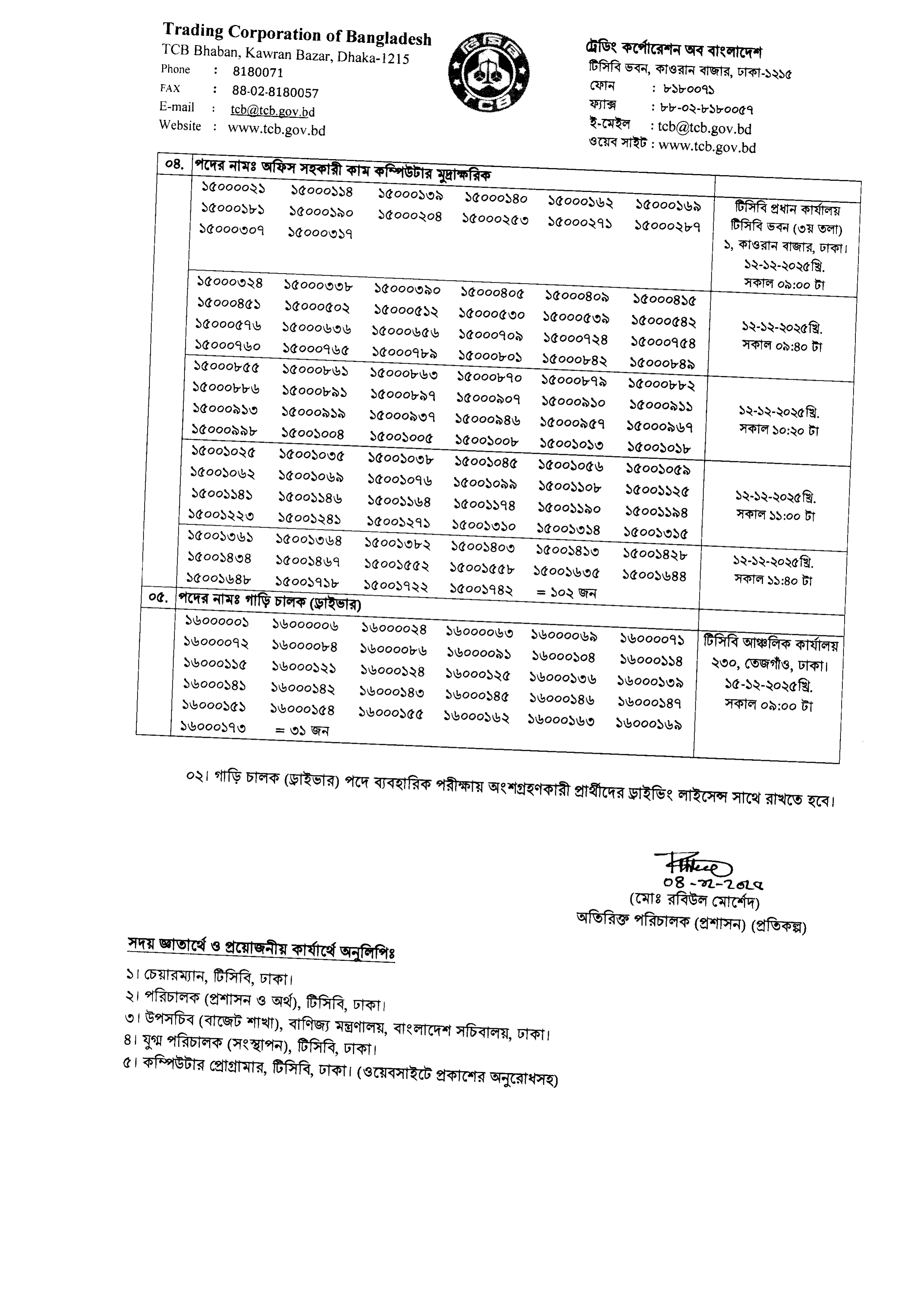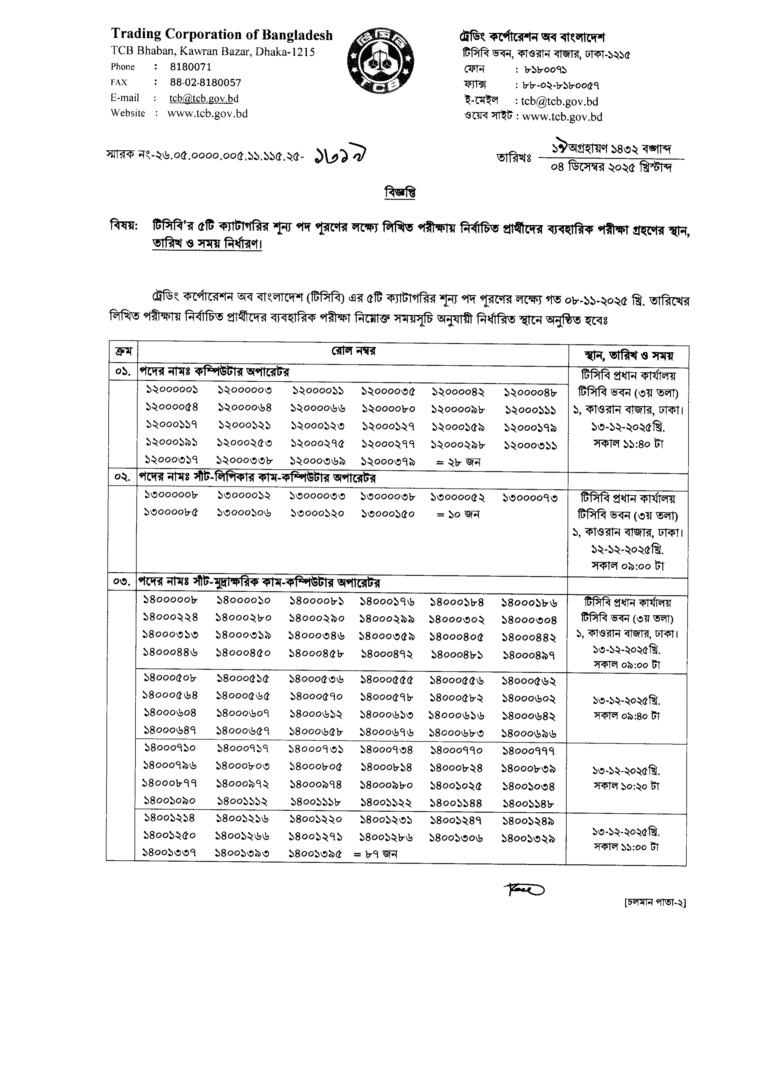 ট্রেডিং কর্পোরেশন অব বাংলাদেশ (টিসিবি) এর ৫টি ক্যাটাগরির শূন্য পদ পূরণের লক্ষ্যে গত ০৮-১১-২০২৫ তারিখে অনুষ্ঠিত লিখিত পরীক্ষায় নির্বাচিত প্রার্থীদের ব্যবহারিক পরীক্ষা নিম্নোক্ত সময়সূচি অনুযায়ী নির্ধারিত স্থানে অনুষ্ঠিত হবে:
