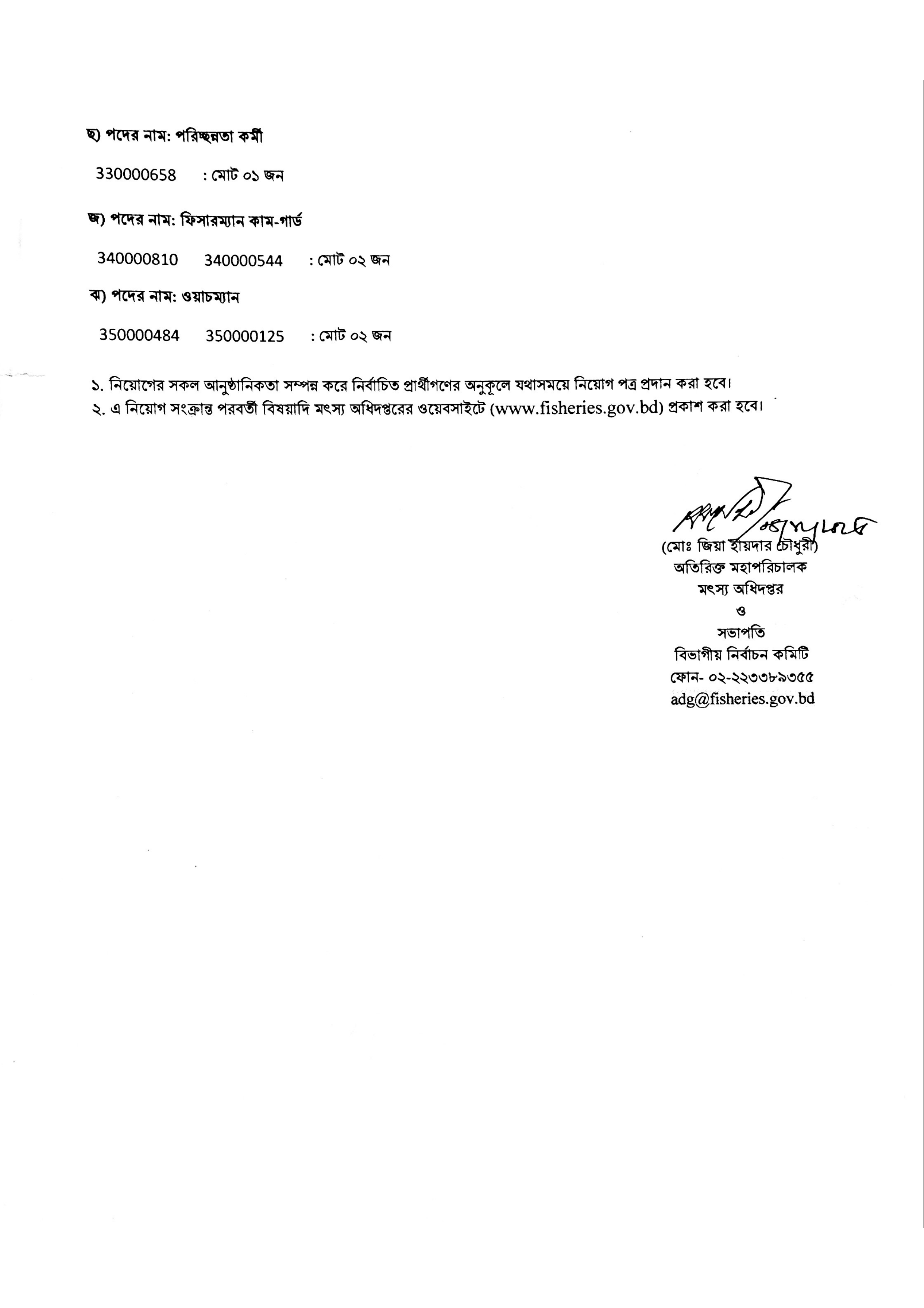 নিয়োগের সকল আনুষ্ঠানিকতা সম্পন্ন করে নির্বাচিত প্রার্থীগণের অনুকূলে যথাসময়ে নিয়োগপত্র প্রদান করা হবে। এই নিয়োগ সংক্রান্ত পরবর্তী সকল তথ্য মৎস্য অধিদপ্তরের ওয়েবসাইটে প্রকাশ করা হবে।