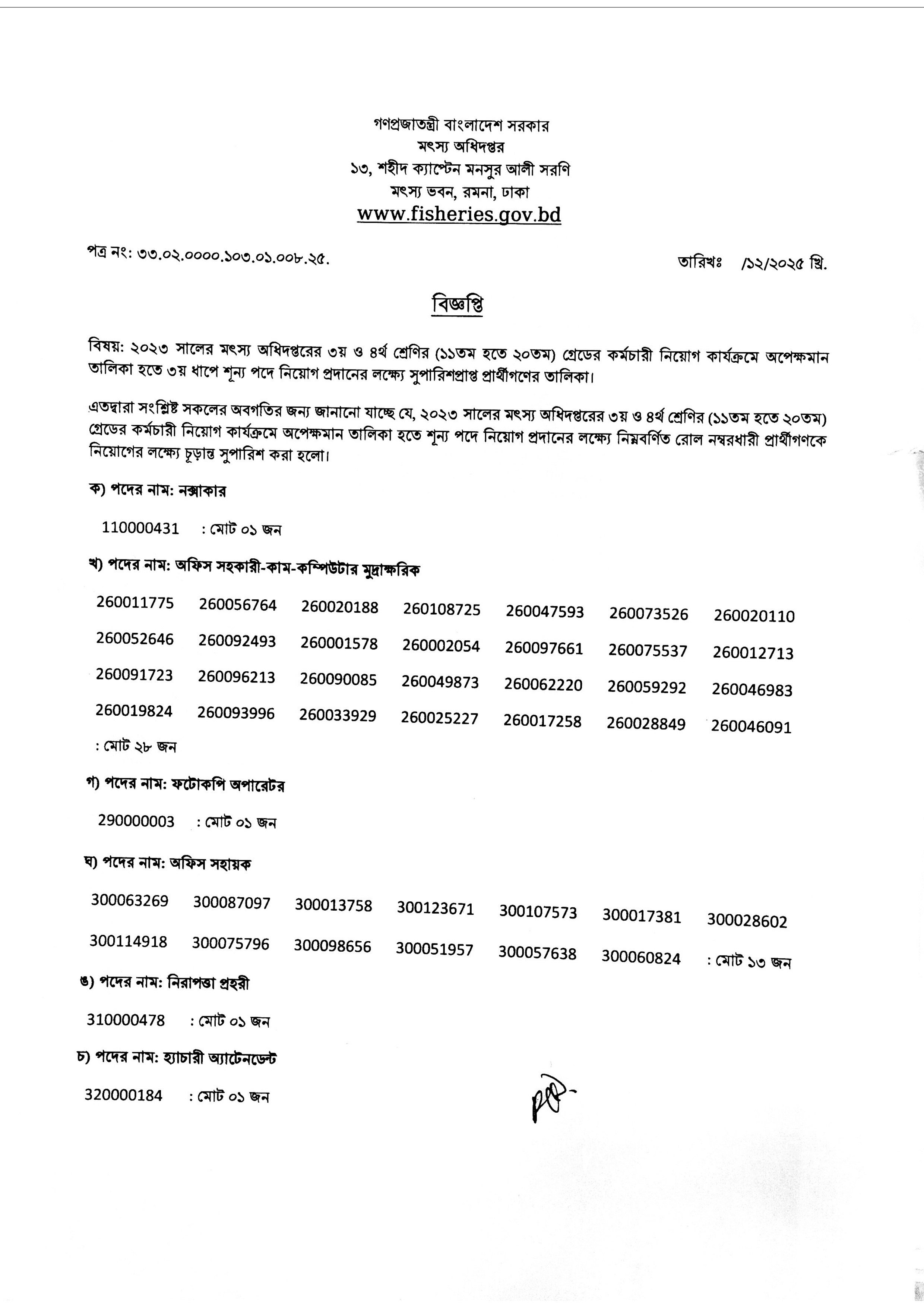 মৎস্য অধিদপ্তর কর্তৃক আয়োজিত ২০২৩ সালের ৩য় ও ৪র্থ শ্রেণির (১১তম হতে ২০তম) গ্রেডের কর্মচারী নিয়োগ কার্যক্রমে অপেক্ষমান তালিকা থেকে ৩য় ধাপে শূন্য পদে নিয়োগ প্রদানের লক্ষ্যে সুপারিশপ্রাপ্ত প্রার্থীগণের তালিকা প্রকাশ করা হয়েছে।