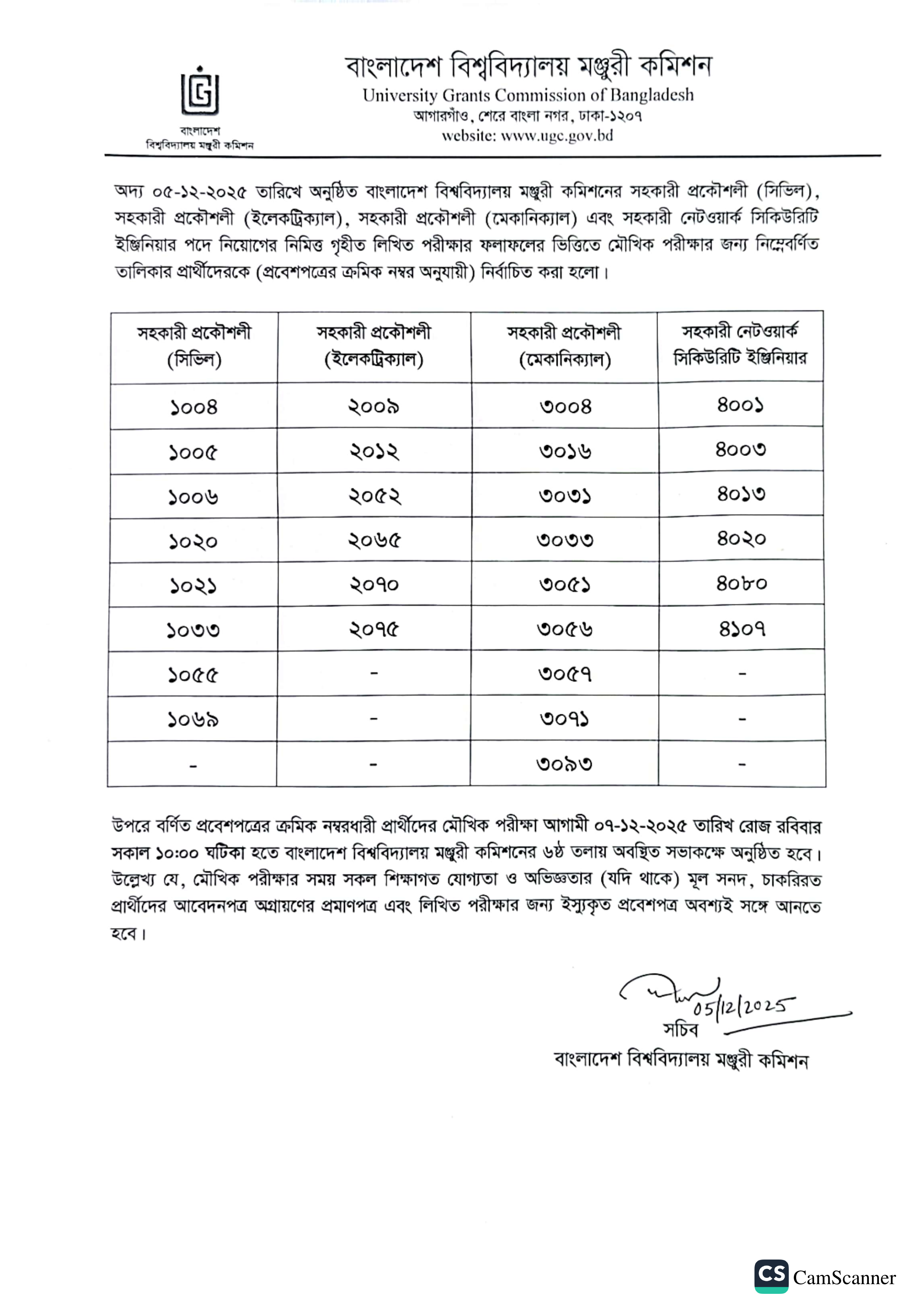 মৌখিক পরীক্ষা ০৭-১২-২০২৫ তারিখ রোজ রবিবার সকাল ১০:০০ ঘটিকা হতে বাংলাদেশ বিশ্ববিদ্যালয় মঞ্জুরী কমিশনের ৬ষ্ঠ তলায় অবস্থিত সভাকক্ষে অনুষ্ঠিত হবে।