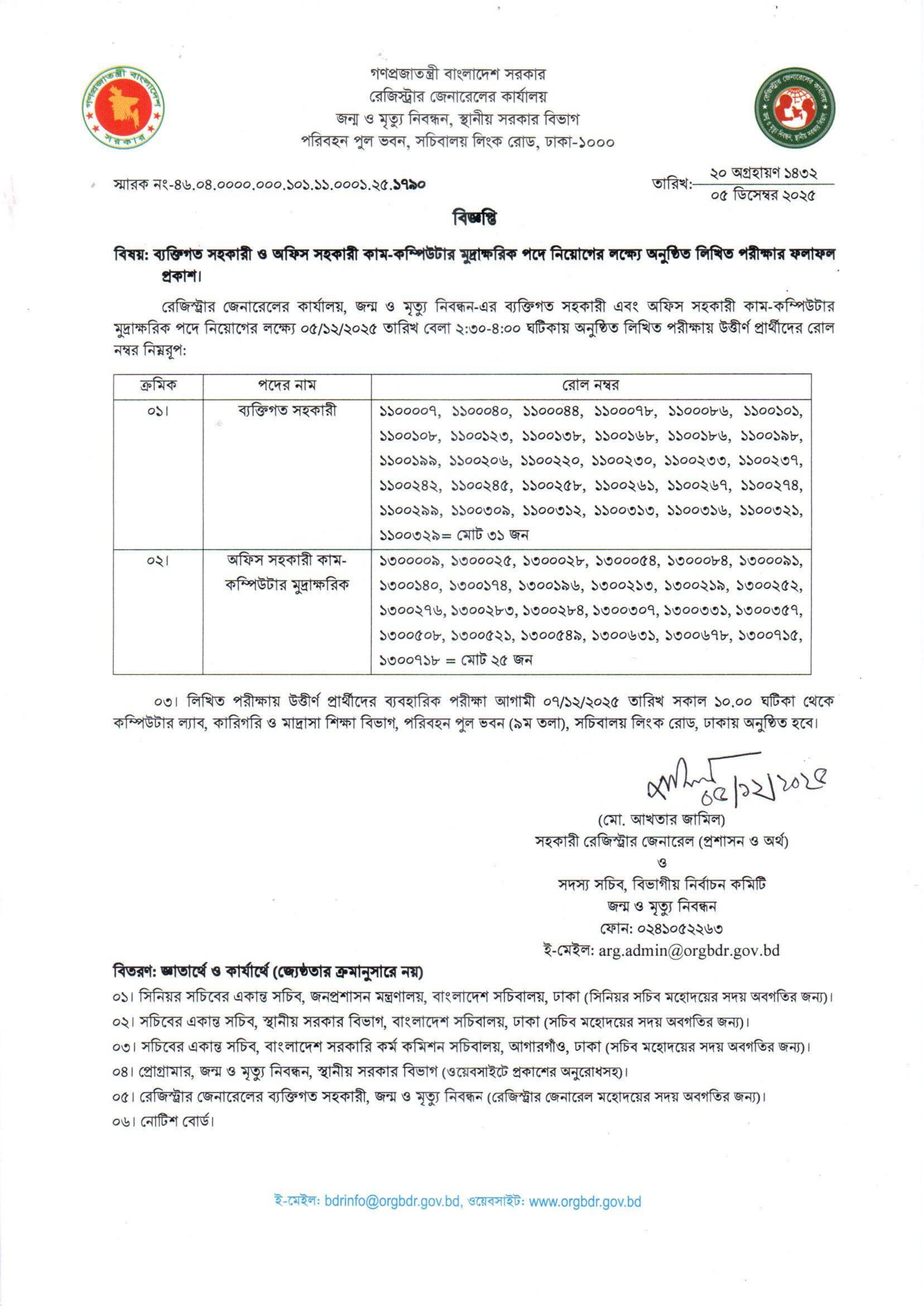 ০৫/১২/২০২৫ তারিখে অনুষ্ঠিত লিখিত পরীক্ষায় মোট ৩১ জন ব্যক্তিগত সহকারী এবং ২৫ জন অফিস সহকারী কাম-কম্পিউটার মুদ্রাক্ষরিক পদে উত্তীর্ণ হয়েছেন।