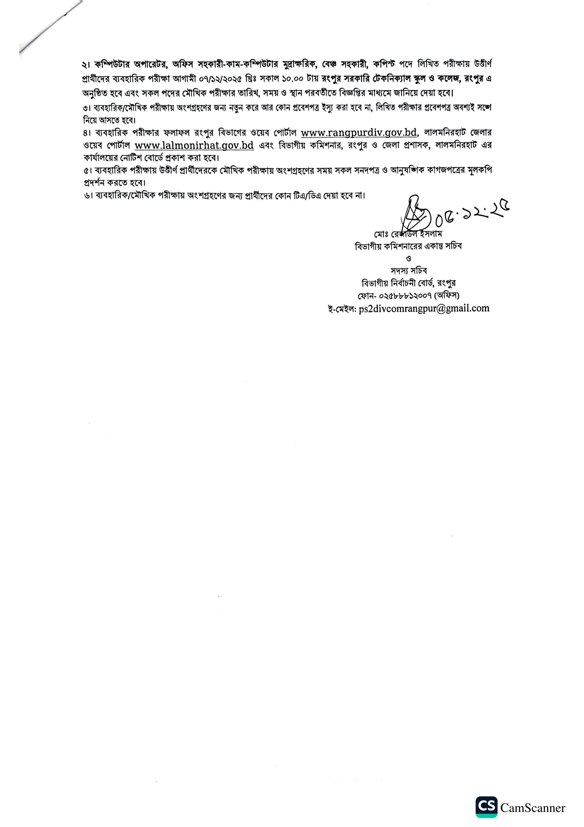 বিজ্ঞপ্তিতে জানানো হয়েছে যে, কম্পিউটার অপারেটর, অফিস সহকারী-কাম-কম্পিউটার মুদ্রাক্ষরিক, বেঞ্চ সহকারী এবং কপিষ্ট পদে লিখিত পরীক্ষায় উত্তীর্ণ প্রার্থীদের ব্যবহারিক পরীক্ষা আগামী ০৭/১২/২০২৫ খ্রিঃ সকাল ১০.০০ টায় রংপুর সরকারি টেকনিক্যাল স্কুল ও কলেজ, রংপুর এ অনুষ্ঠিত হবে।