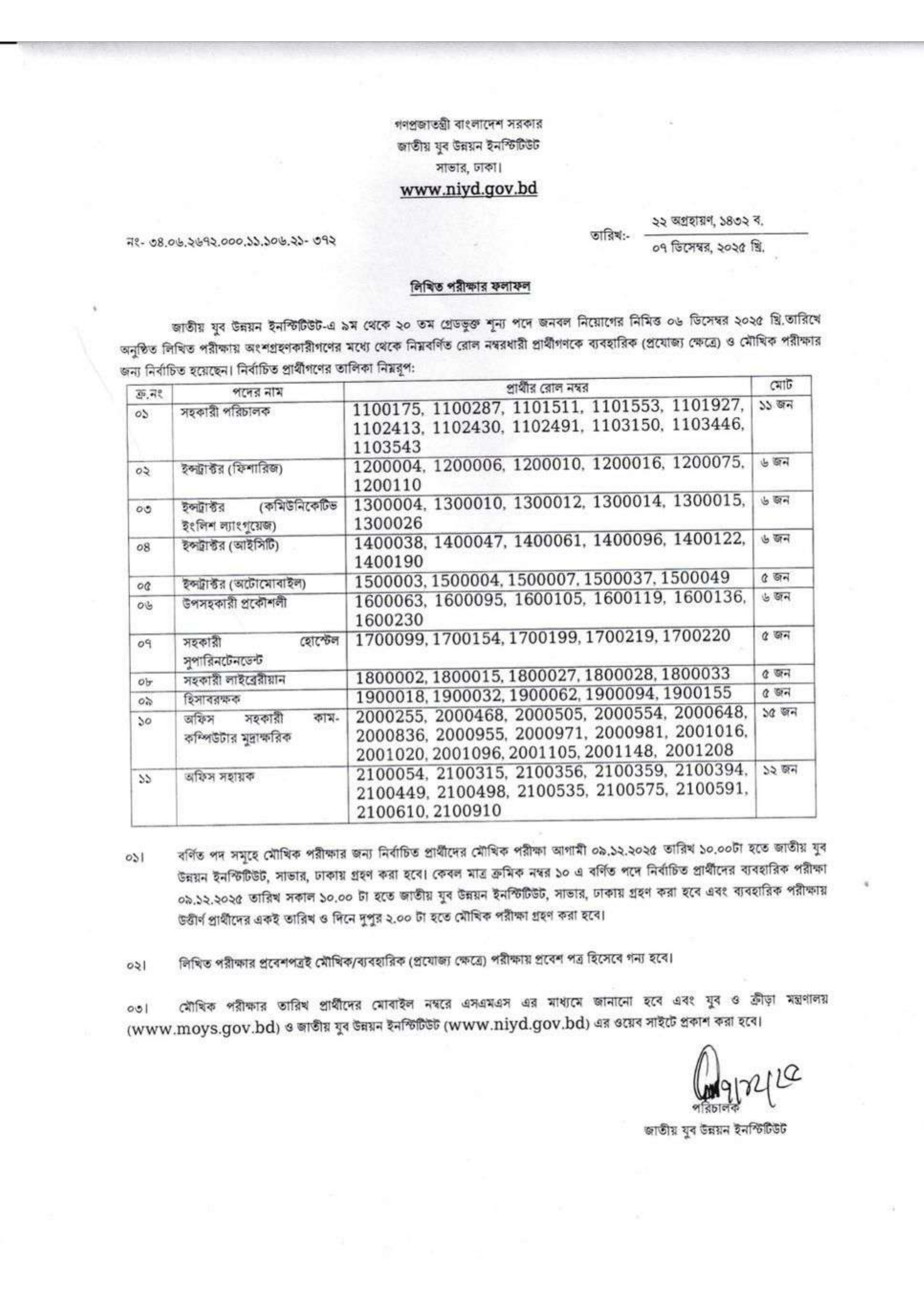 নির্বাচিত প্রার্থীদের মৌখিক পরীক্ষা আগামী ০৯ ডিসেম্বর ২০২৫ তারিখ সকাল ১০:০০ টা থেকে জাতীয় যুব উন্নয়ন ইনস্টিটিউট, সাভার, ঢাকায় অনুষ্ঠিত হবে।