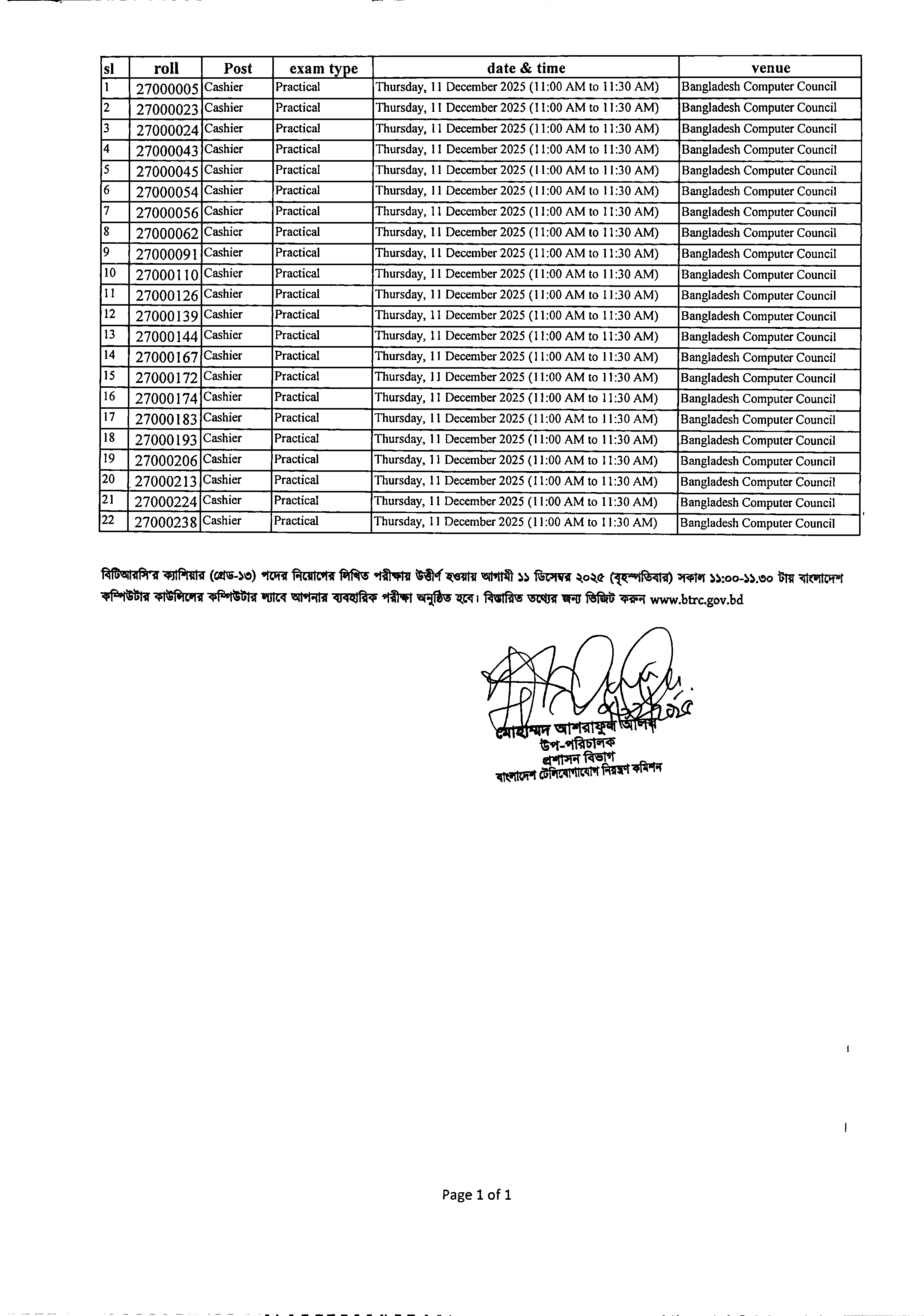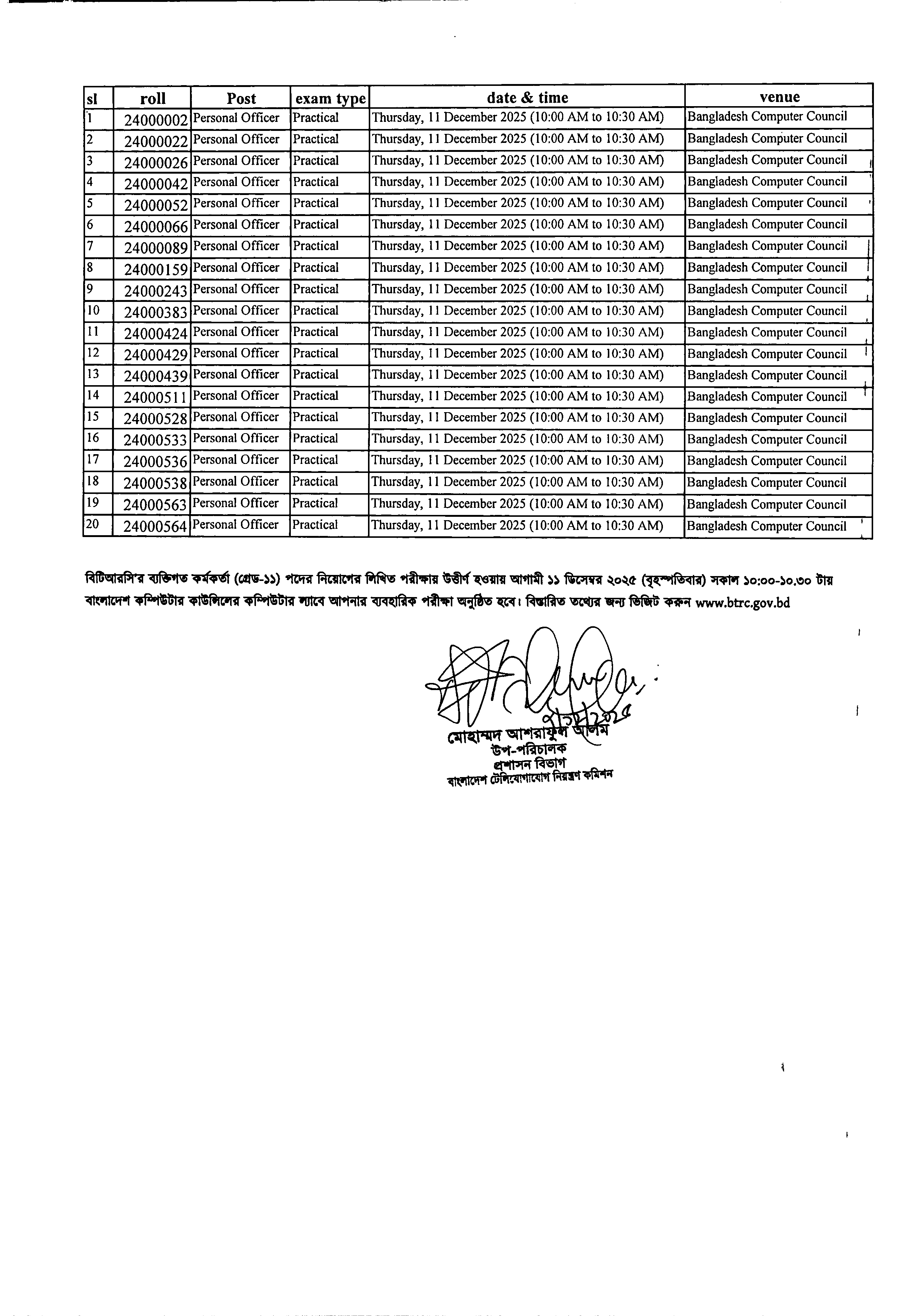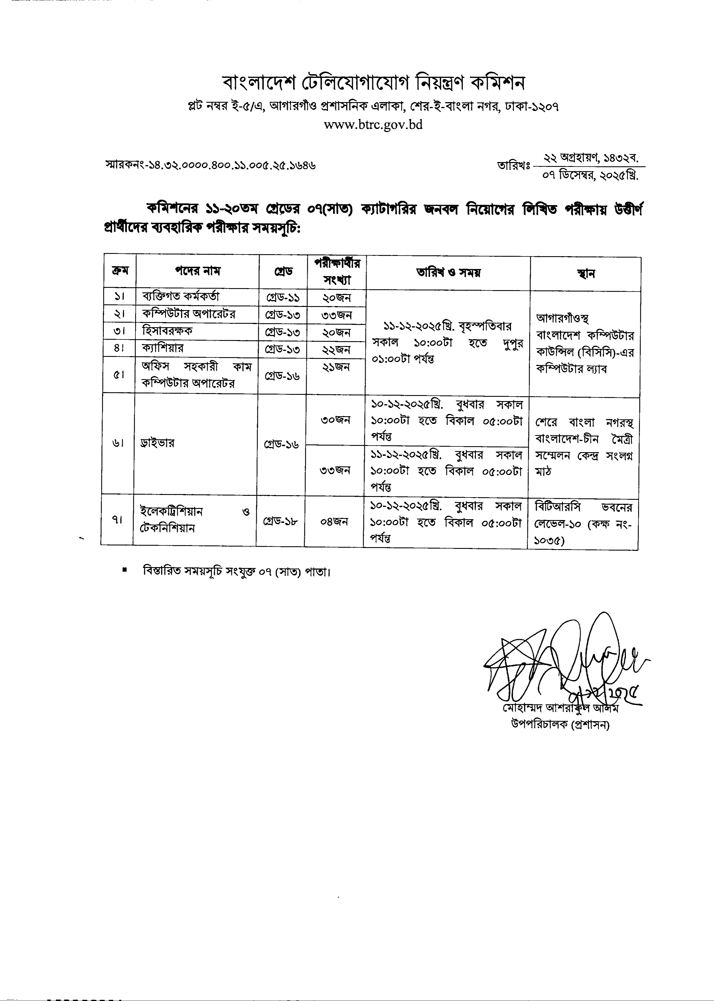 বাংলাদেশ টেলিযোগাযোগ নিয়ন্ত্রণ কমিশন (বিটিআরসি) তাদের ১১-২০তম গ্রেডের জনবল নিয়োগের লিখিত পরীক্ষায় উত্তীর্ণ প্রার্থীদের ব্যবহারিক পরীক্ষার সময়সূচি প্রকাশ করেছে। এই পরীক্ষাগুলো ১০ ও ১১ ডিসেম্বর ২০২৫ তারিখে অনুষ্ঠিত হবে।