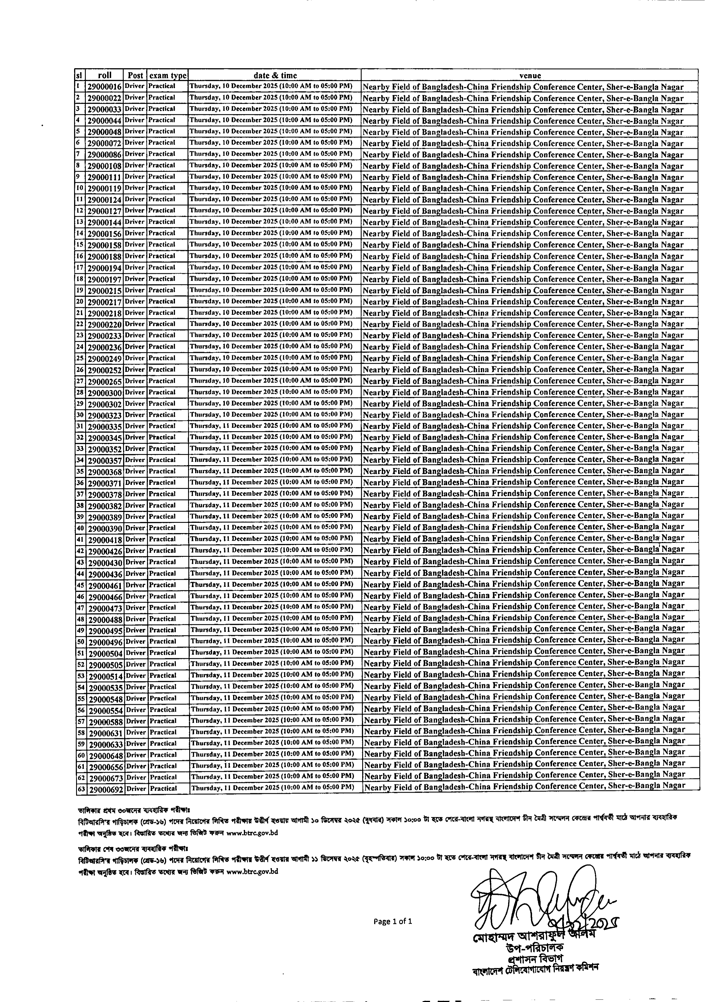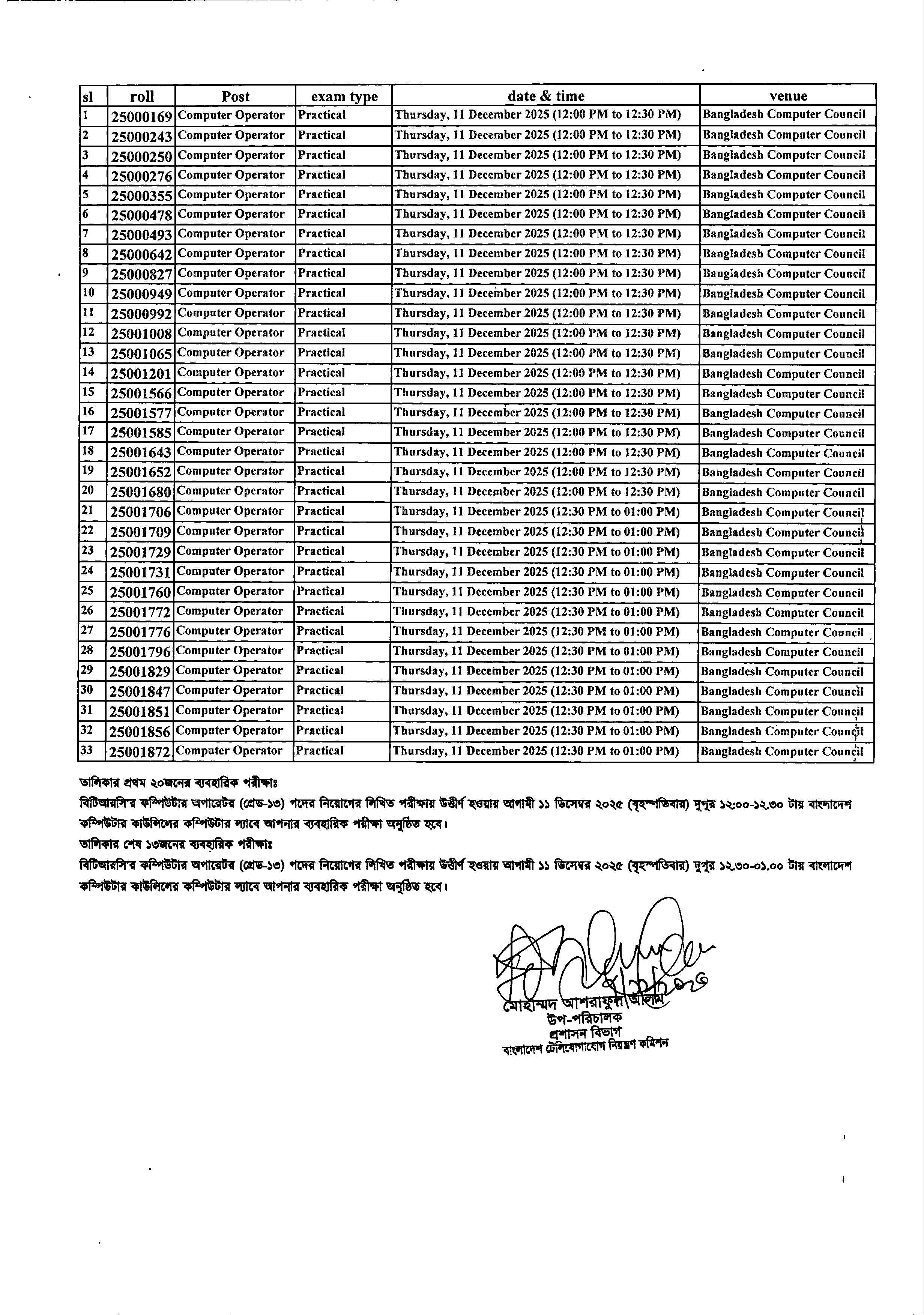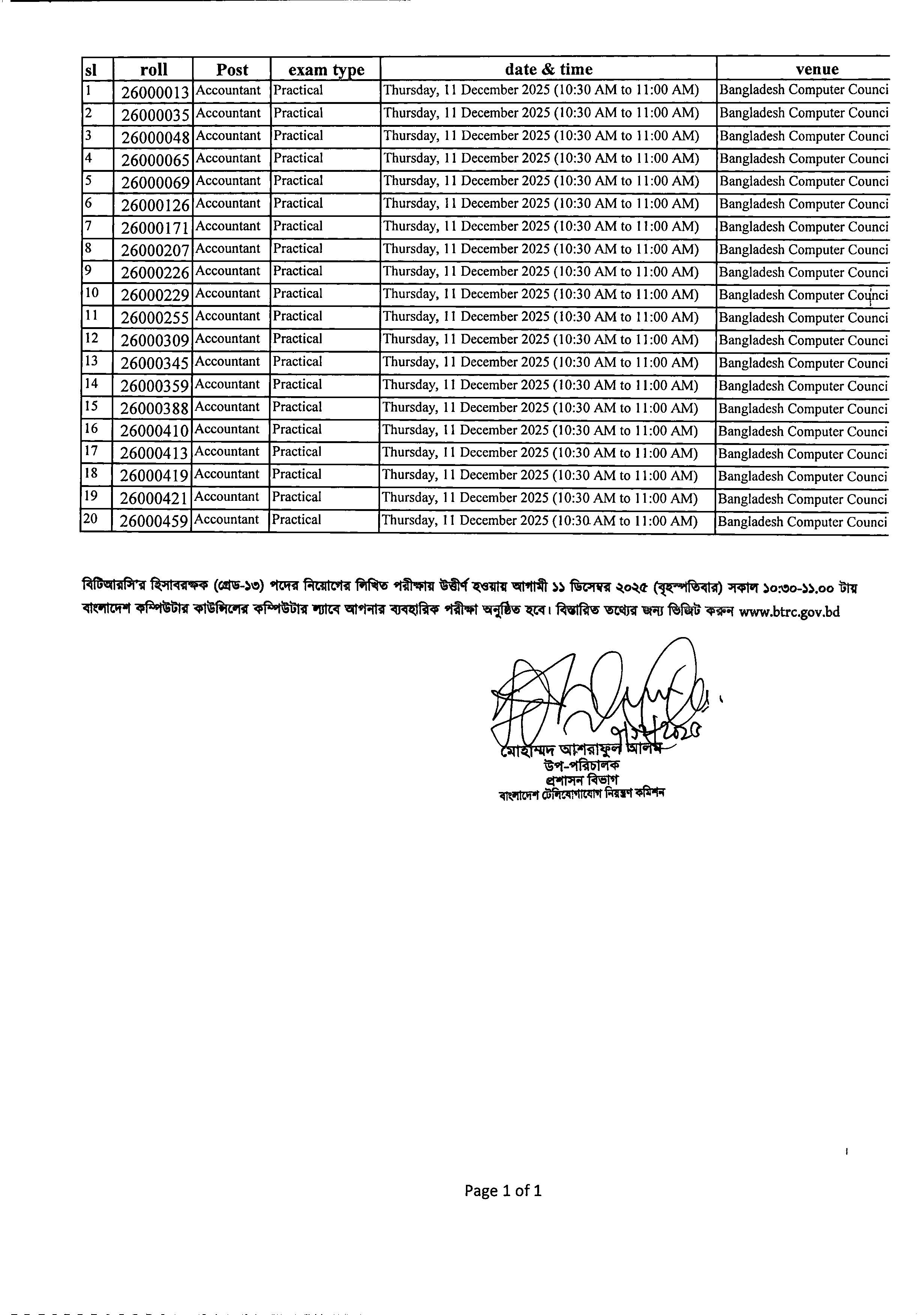 বাংলাদেশ টেলিযোগাযোগ নিয়ন্ত্রণ কমিশন (বিটিআরসি) তাদের ১১-২০তম গ্রেডের জনবল নিয়োগের লিখিত পরীক্ষায় উত্তীর্ণ প্রার্থীদের ব্যবহারিক পরীক্ষার সময়সূচি প্রকাশ করেছে। এই পরীক্ষাগুলো ১০ ও ১১ ডিসেম্বর ২০২৫ তারিখে অনুষ্ঠিত হবে।