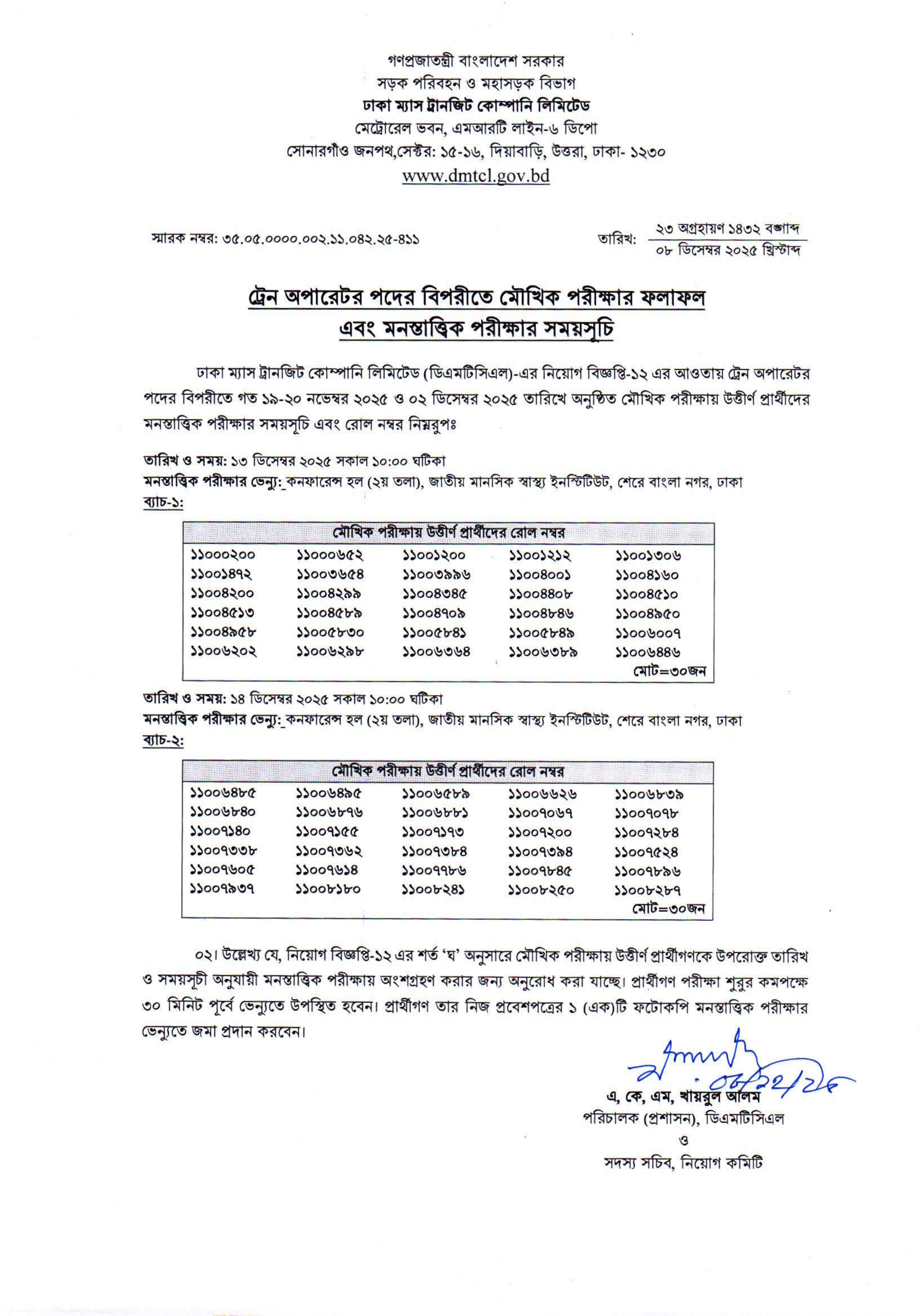 ঢাকা ম্যাস ট্রানজিট কোম্পানি লিমিটেড (ডিএমটিসিএল)-এর ট্রেন অপারেটর পদের বিপরীতে অনুষ্ঠিত মৌখিক পরীক্ষার ফলাফল এবং উত্তীর্ণ প্রার্থীদের মনস্তাত্তিক পরীক্ষার সময়সূচি প্রকাশিত হয়েছে।