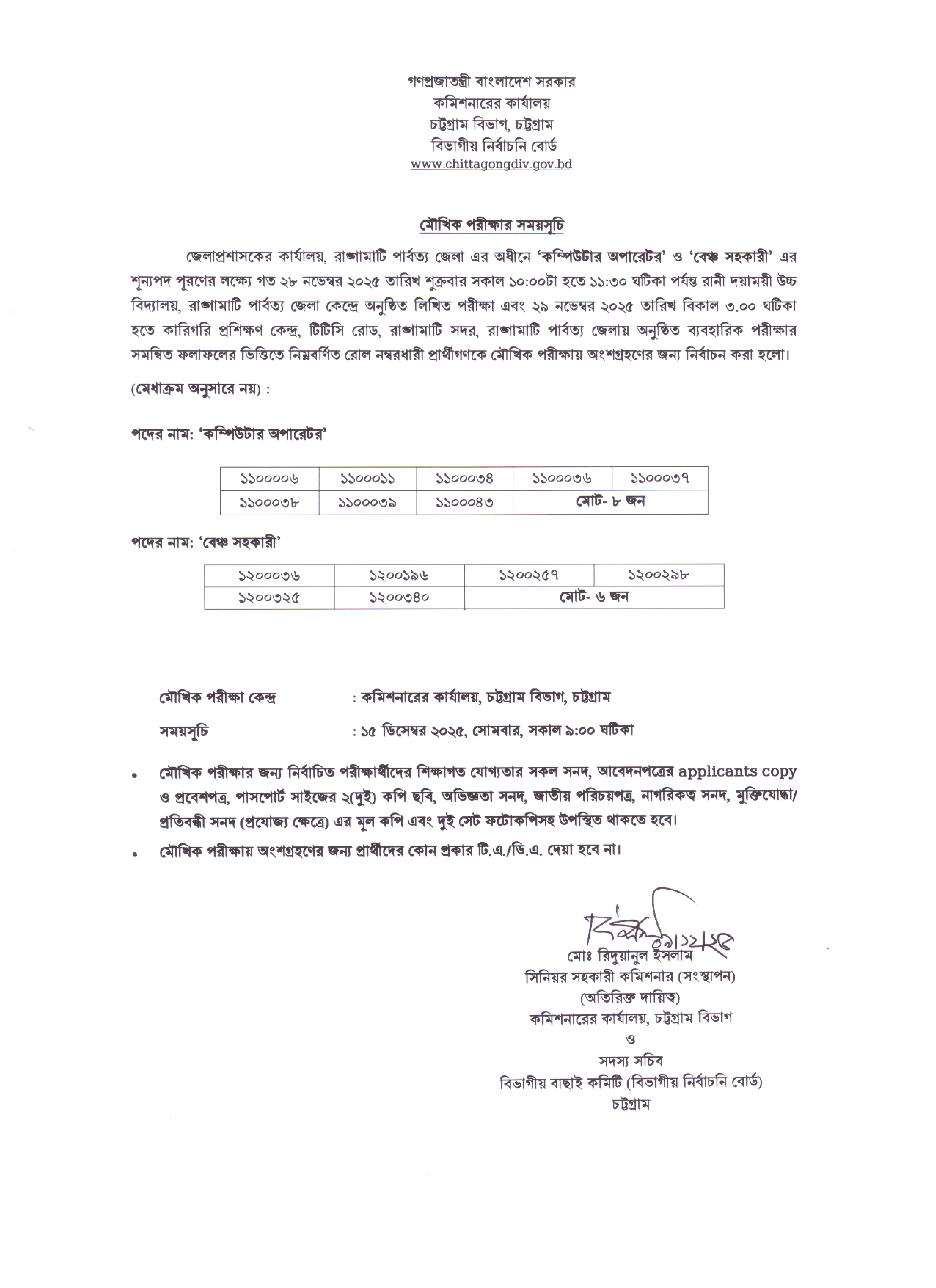 জেলাপ্রশাসকের কার্যালয়, রাঙ্গামাটি পার্বত্য জেলার অধীনে “কম্পিউটার অপারেটর” এবং “বেঞ্চ সহকারী” পদের লিখিত ও ব্যবহারিক পরীক্ষার সমন্বিত ফলাফলের ভিত্তিতে নির্বাচিত প্রার্থীদের মৌখিক পরীক্ষার সময়সূচি প্রকাশিত হয়েছে।