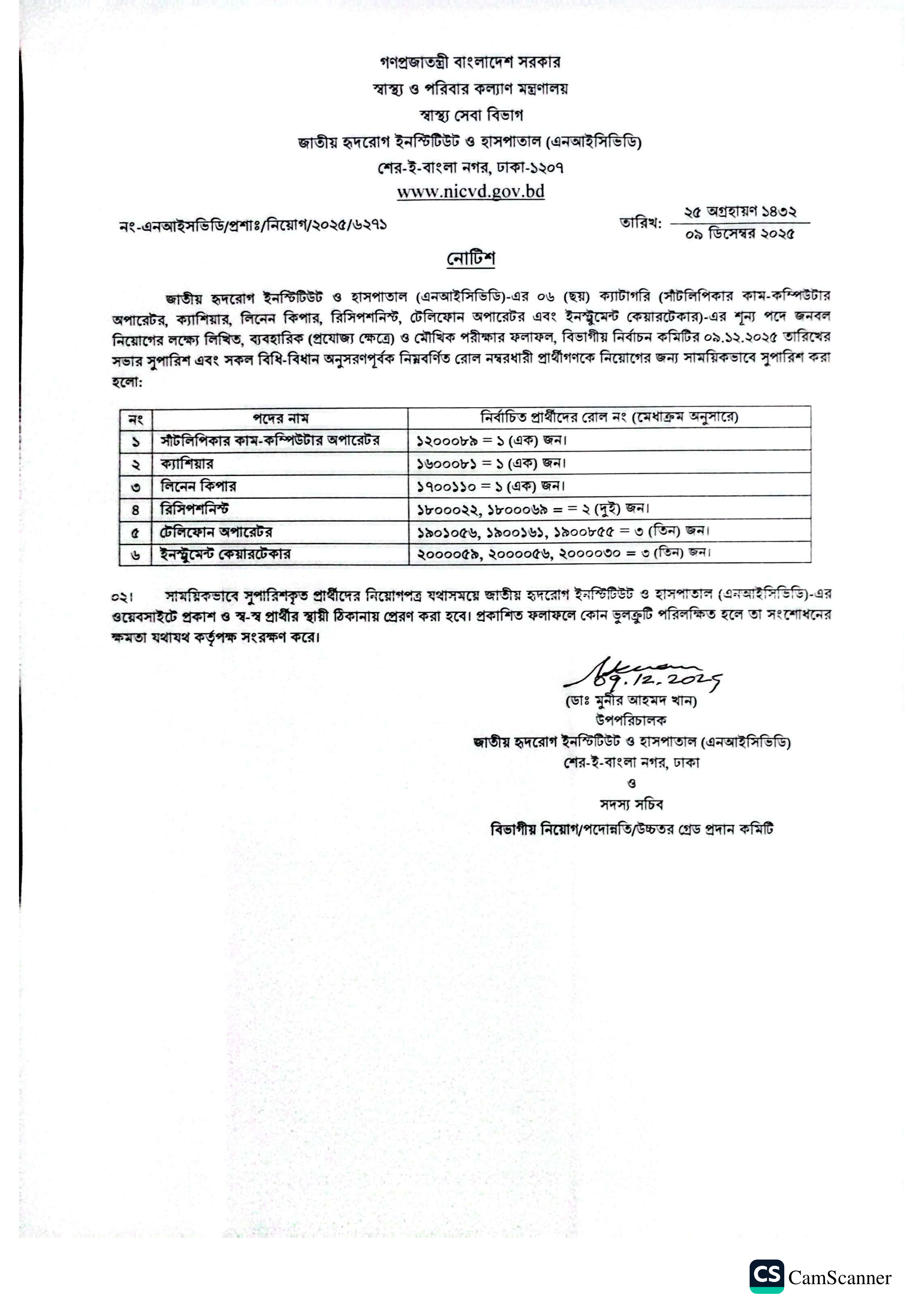 জাতীয় হৃদরোগ ইনস্টিটিউট ও হাসপাতাল (এনআইসিভিডি)-এর ০৬ (ছয়) ক্যাটাগরির শূন্য পদে জনবল নিয়োগের লক্ষ্যে অনুষ্ঠিত লিখিত, ব্যবহারিক (প্রযোজ্য ক্ষেত্রে) ও মৌখিক পরীক্ষার ফলাফল প্রকাশিত হয়েছে।