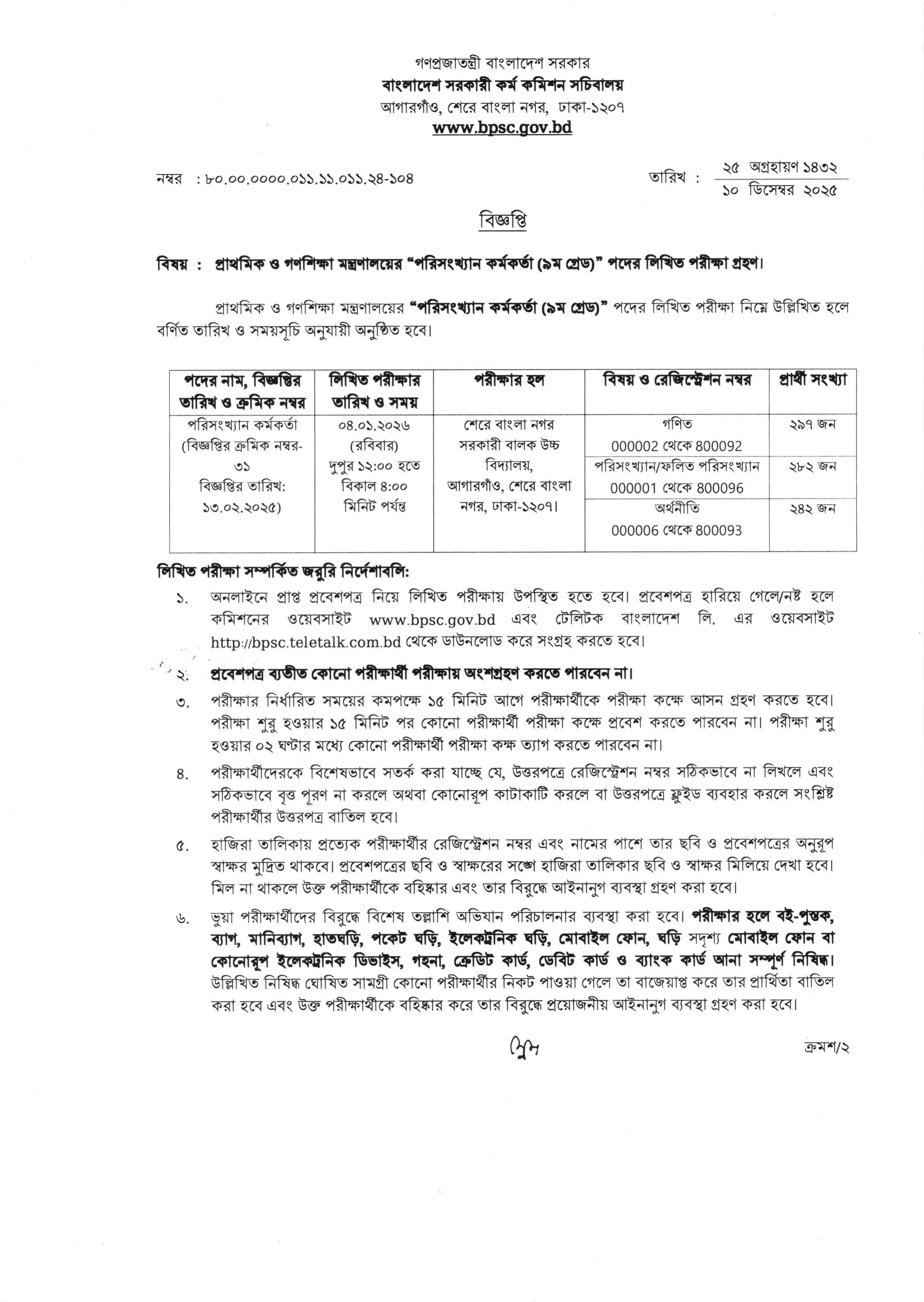 বাংলাদেশ সরকারী কর্ম কমিশন (BPSC) কর্তৃক প্রাথমিক ও গণশিক্ষা মন্ত্রণালয়ের অধীনে পরিসংখ্যান কর্মকর্তা (৯ম গ্রেড) পদের লিখিত পরীক্ষার সময়সূচি ঘোষণা করা হয়েছে।