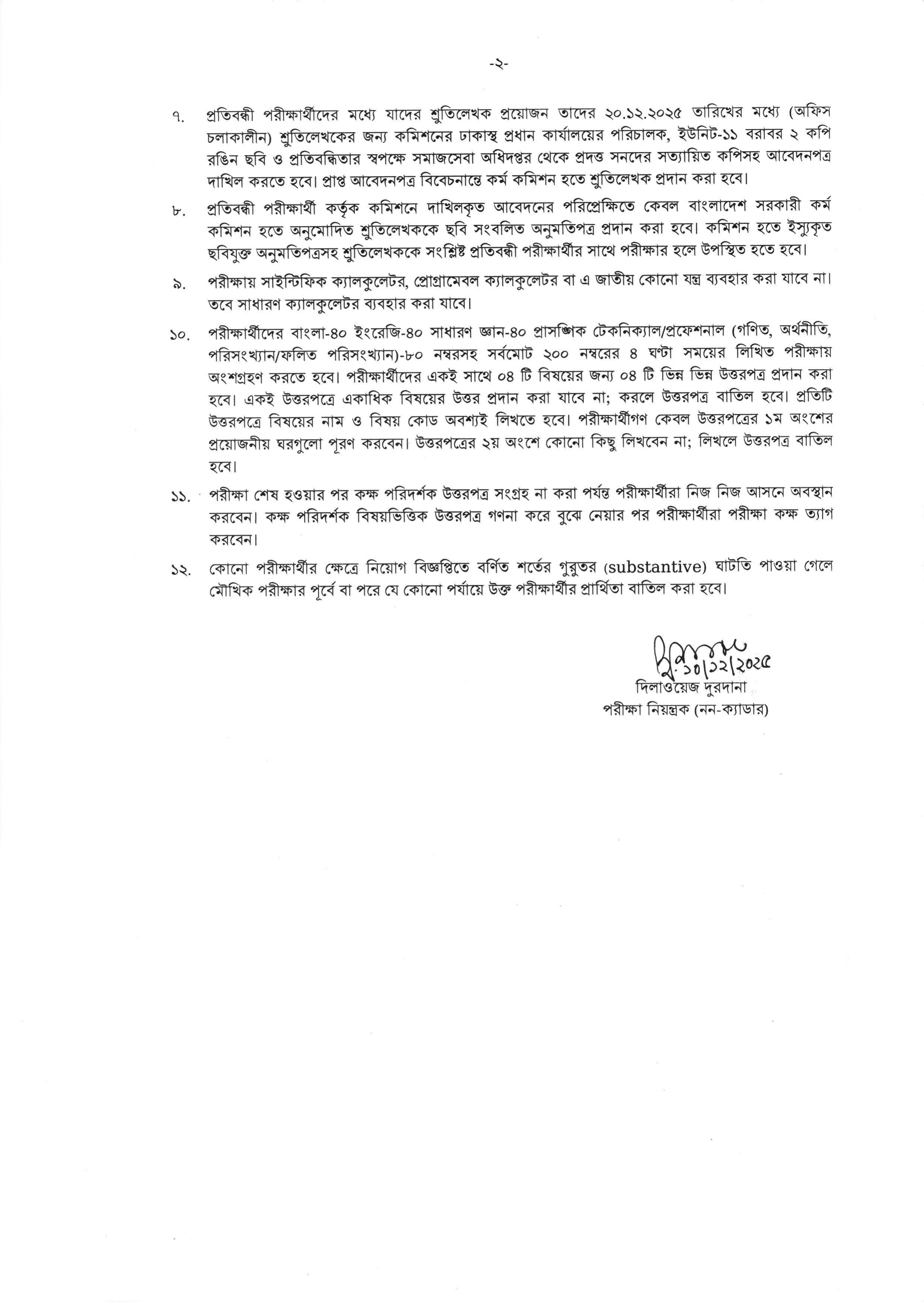 - দৃষ্টিপ্রতিবন্ধী পরীক্ষার্থীদের শ্রুতিলেখকের জন্য ২০ ডিসেম্বর ২০২৫ তারিখের মধ্যে (অফিস চলাকালীন) কমিশনের ঢাকাস্থ প্রধান কার্যালয়ের পরিচালক, ইউনিট-১১ বরাবর ২ কপি রঙিন ছবি ও প্রতিবন্ধিতার স্বপক্ষে সমাজসেবা অধিদপ্তর থেকে প্রদত্ত সনদের সত্যায়িত কপিসহ আবেদনপত্র দাখিল করতে হবে।