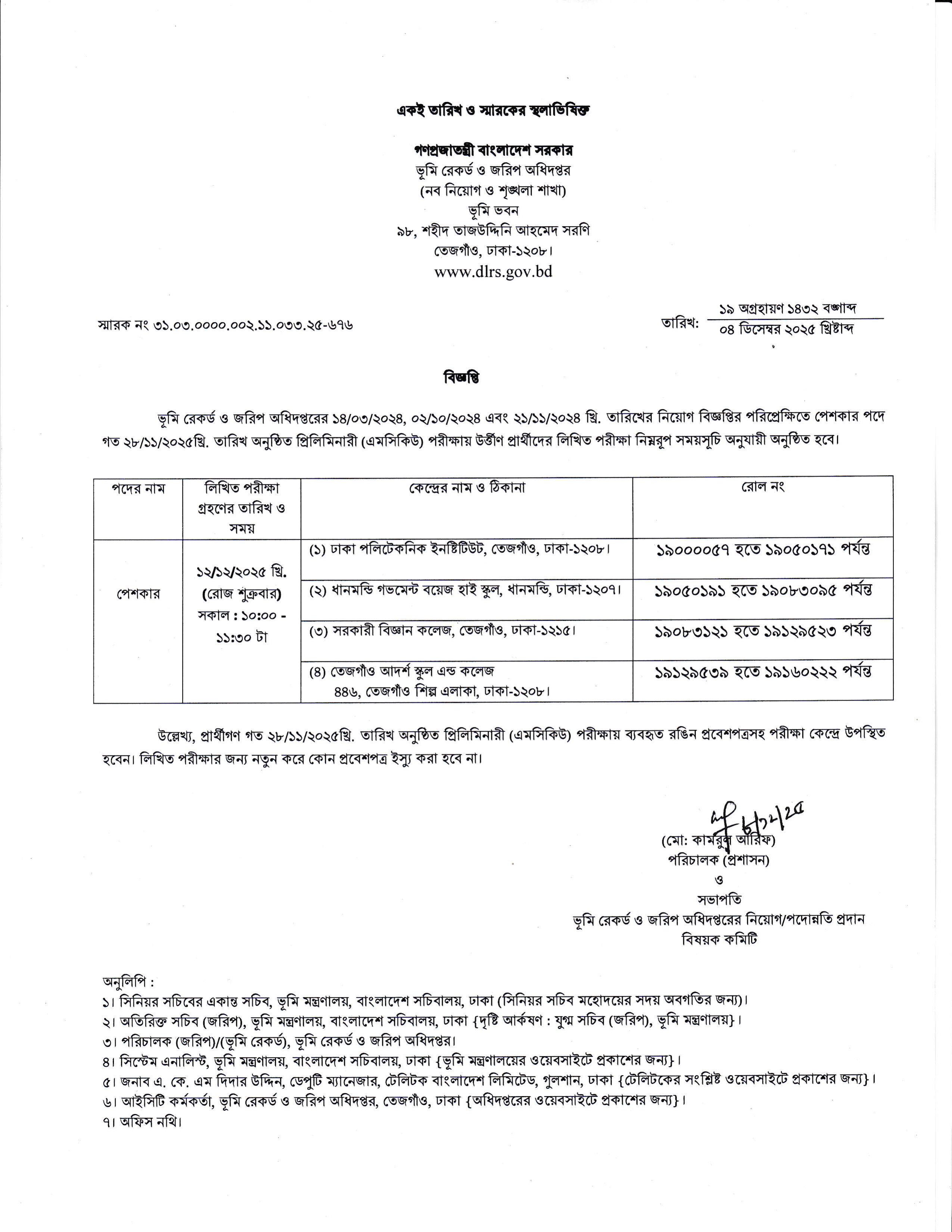 ভূমি রেকর্ড ও জরিপ অধিদপ্তরের পূর্বের নিয়োগ বিজ্ঞপ্তির (১৪/০৩/২০২৪, ০২/১০/২০২৪ এবং ২১/১১/২০২৪) পরিপ্রেক্ষিতে পেশকার পদে গত ২৮/১১/২০২৫ তারিখে অনুষ্ঠিত প্রিলিমিনারী (এমসিকিউ) পরীক্ষায় উত্তীর্ণ প্রার্থীদের লিখিত পরীক্ষার সময়সূচি প্রকাশিত হয়েছে।
