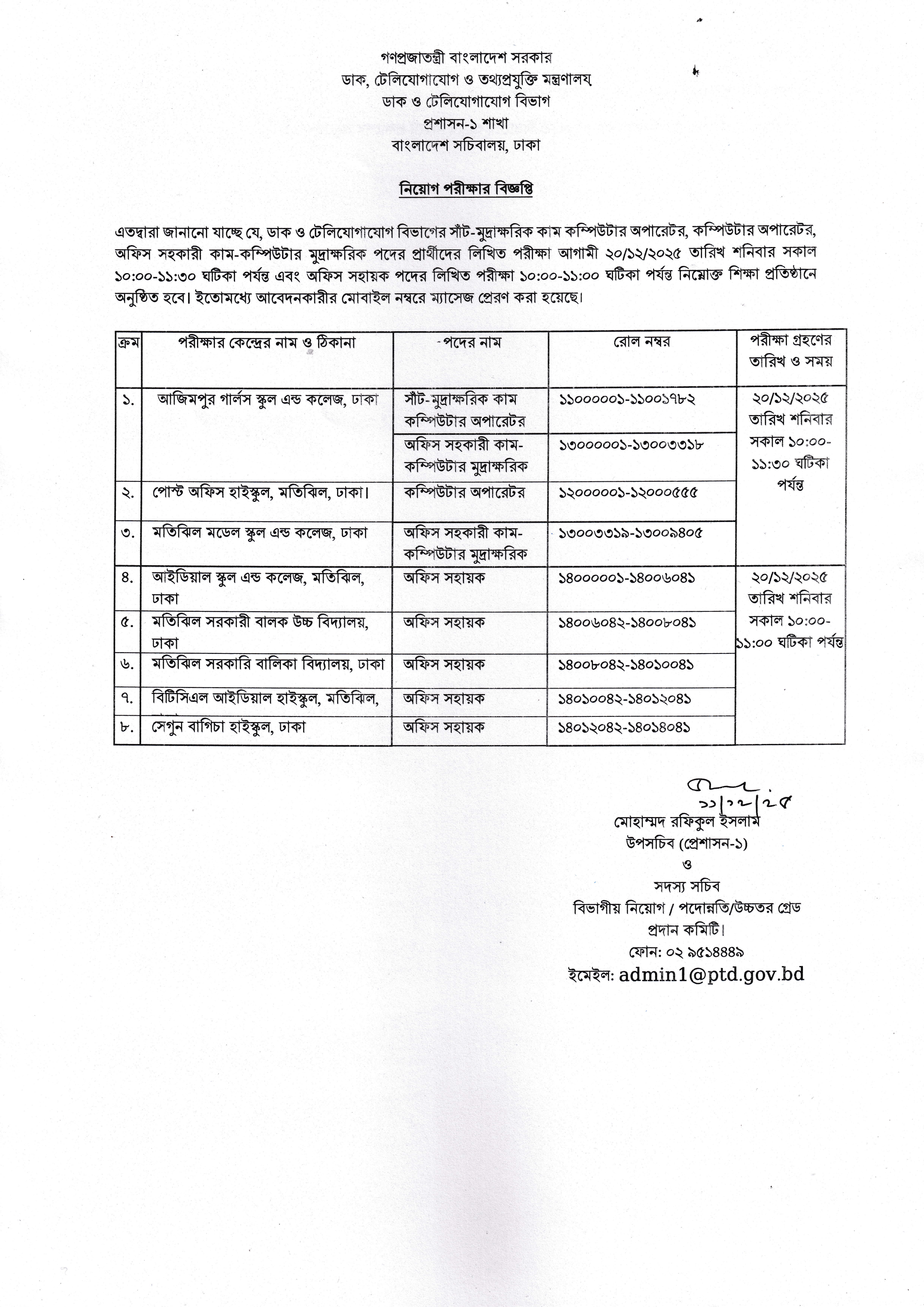 গণপ্রজাতন্ত্রী বাংলাদেশ সরকারের ডাক, টেলিযোগাযোগ ও তথ্যপ্রযুক্তি মন্ত্রণালয়ের অধীনে ডাক ও টেলিযোগাযোগ বিভাগের বিভিন্ন পদের লিখিত পরীক্ষার সময়সূচি প্রকাশিত হয়েছে।