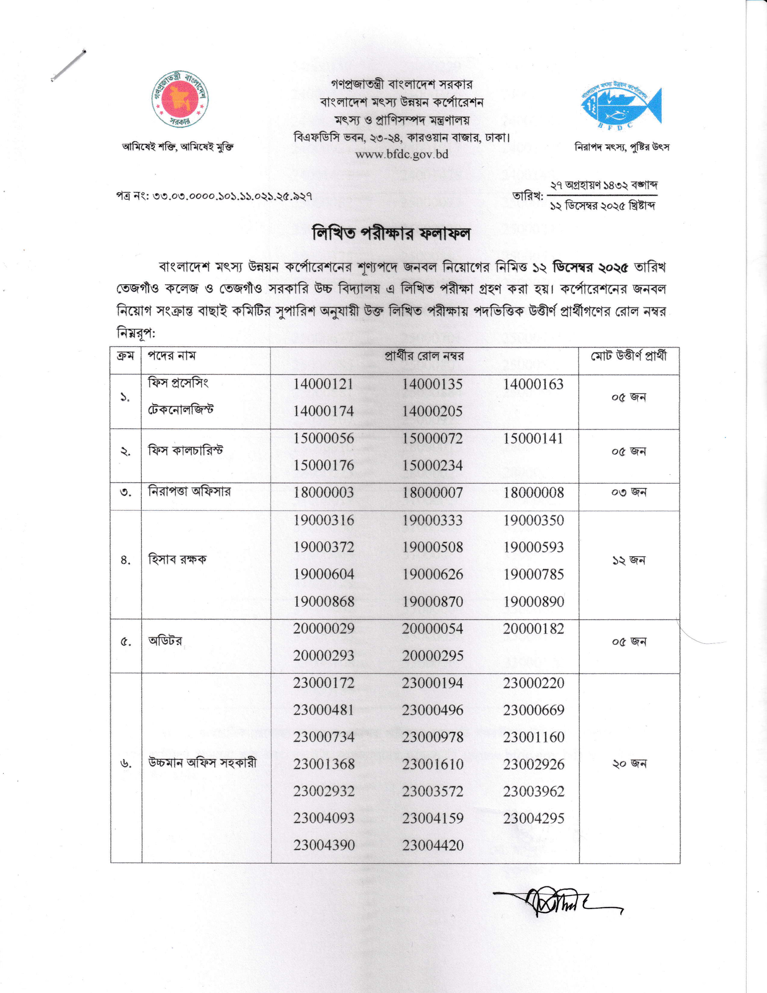 বাংলাদেশ মৎস্য উন্নয়ন কর্পোরেশনের শূন্যপদে জনবল নিয়োগের নিমিত্ত অনুষ্ঠিত লিখিত পরীক্ষার ফলাফল প্রকাশিত হয়েছে। এই পরীক্ষাটি ১২ ডিসেম্বর ২০২৫ তারিখে তেজগাঁও কলেজ ও তেজগাঁও সরকারি উচ্চ বিদ্যালয়ে অনুষ্ঠিত হয়েছিল।