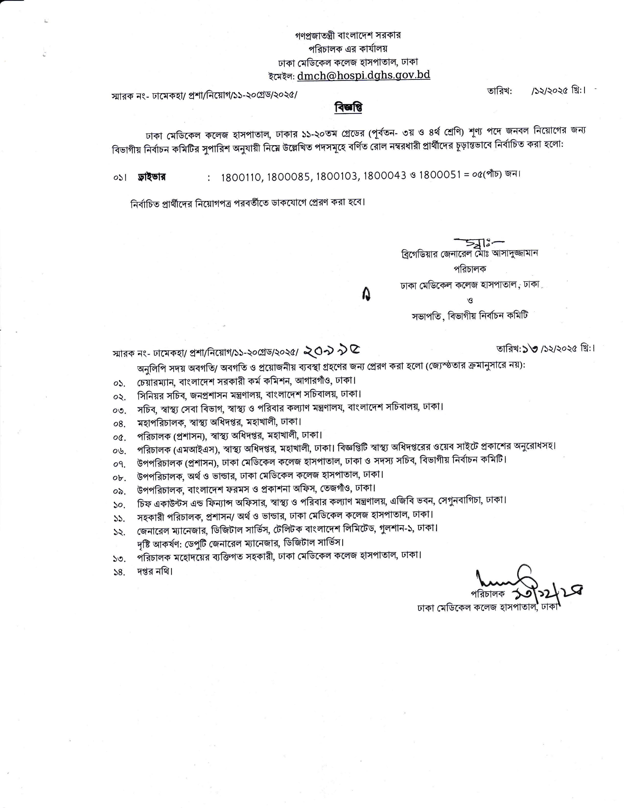 ঢাকা মেডিকেল কলেজ হাসপাতাল, ঢাকার ১১-২০তম গ্রেডের শূন্য পদে জনবল নিয়োগের জন্য বিভাগীয় নির্বাচন কমিটির সুপারিশ অনুযায়ী প্রার্থীদের চূড়ান্তভাবে নির্বাচিত করা হয়েছে।