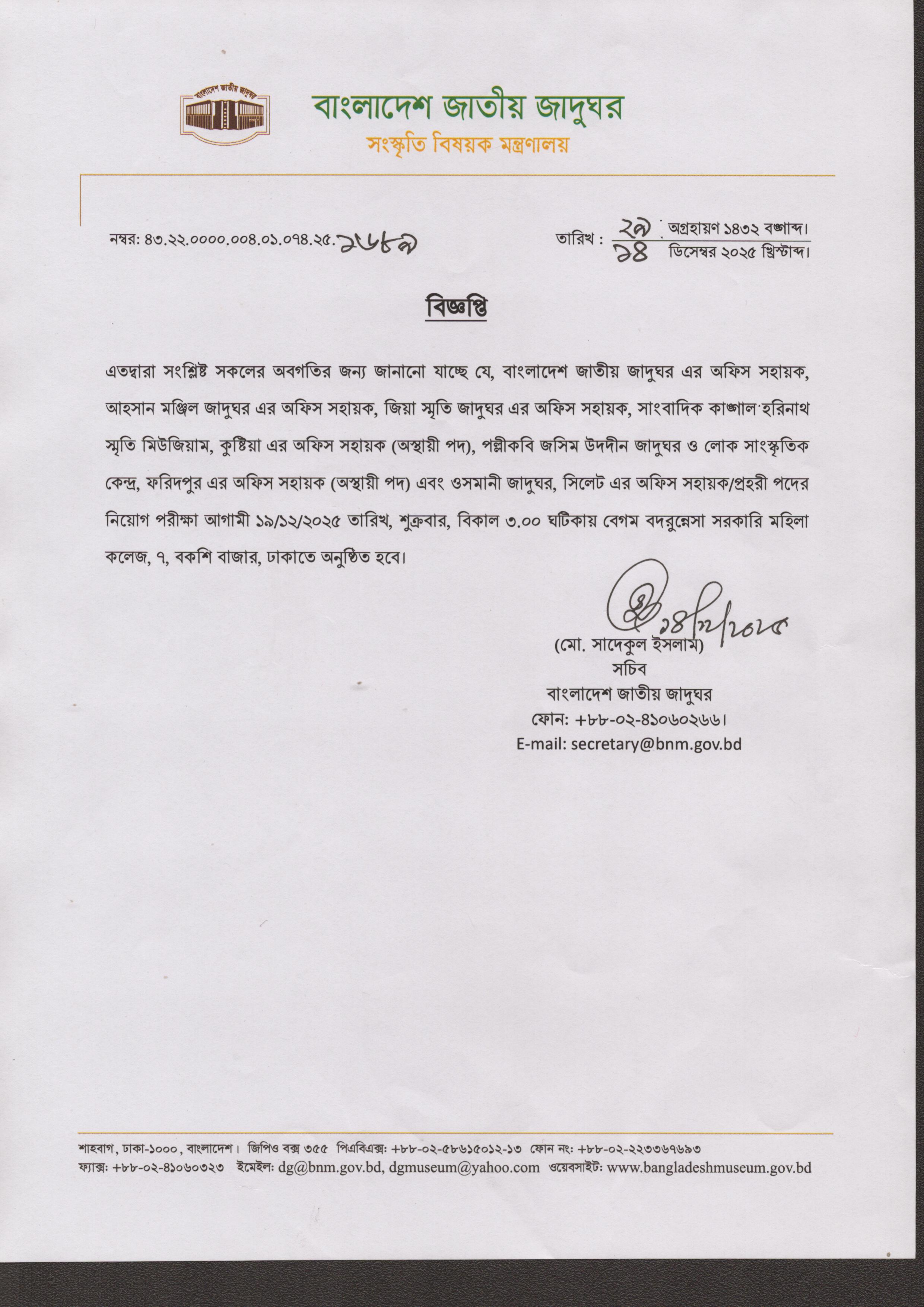 বাংলাদেশ জাতীয় জাদুঘরের আওতাধীন অফিস সহায়ক, আহসান মঞ্জিল জাদুঘরের অফিস সহায়ক, জিয়া স্মৃতি জাদুঘরের অফিস সহায়ক, সাংবাদিক কাঙ্গাল হরিনাথ স্মৃতি মিউজিয়াম, কুষ্টিয়ার অফিস সহায়ক (অস্থায়ী পদ), পল্লীকবি জসিম উদ্দীন জাদুঘর ও লোক সাংস্কৃতিক কেন্দ্র, ফরিদপুরের অফিস সহায়ক (অস্থায়ী পদ) এবং ওসমানী জাদুঘর, সিলেটের অফিস সহায়ক/প্রহরী পদের নিয়োগ পরীক্ষা সম্পর্কিত জরুরি বিজ্ঞপ্তি প্রকাশিত হয়েছে।