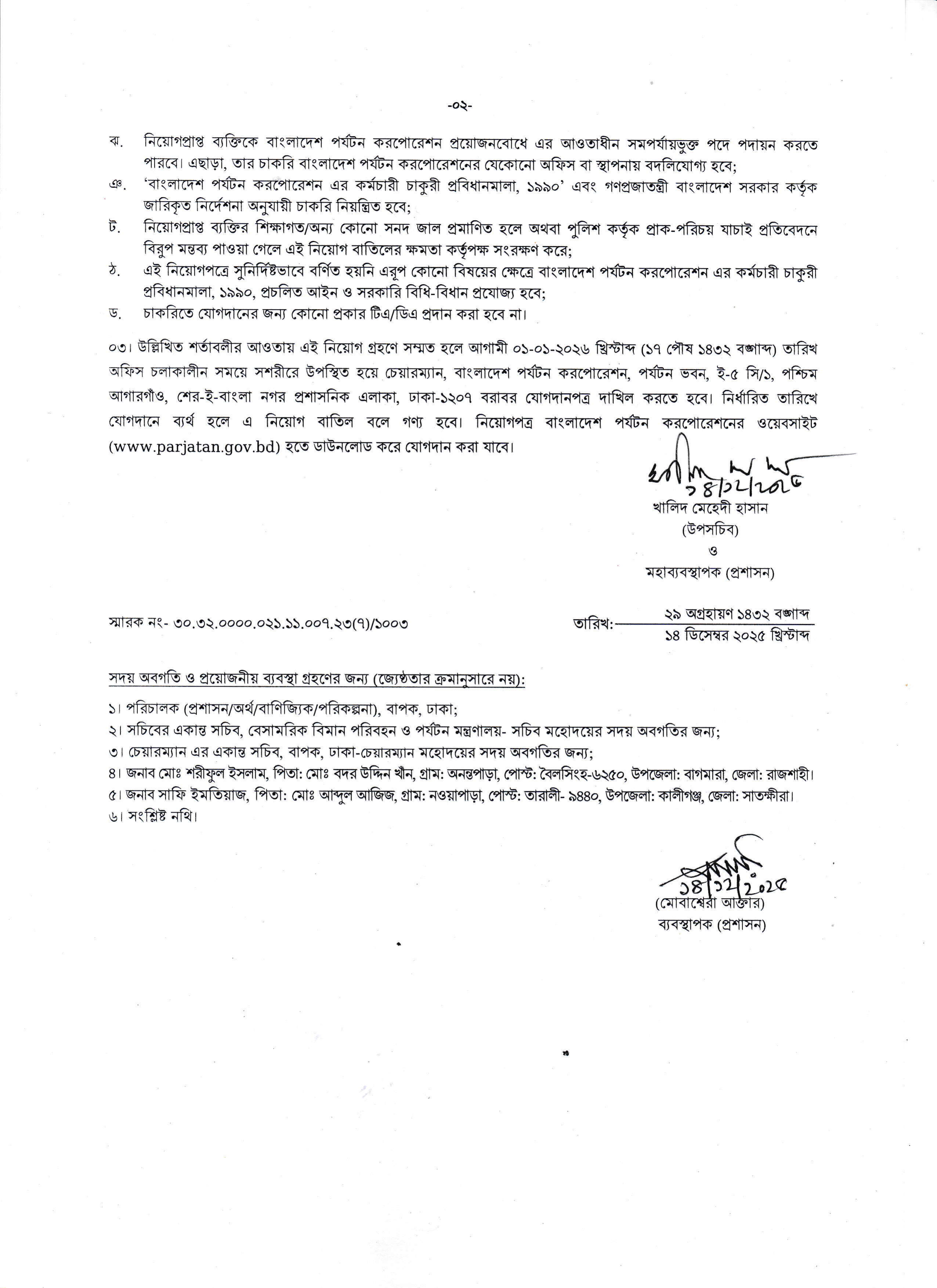 নিয়োগপত্র বাংলাদেশ পর্যটন করপোরেশনের ওয়েবসাইট (www.parjatan.gov.bd) হতে ডাউনলোড করা যাবে।