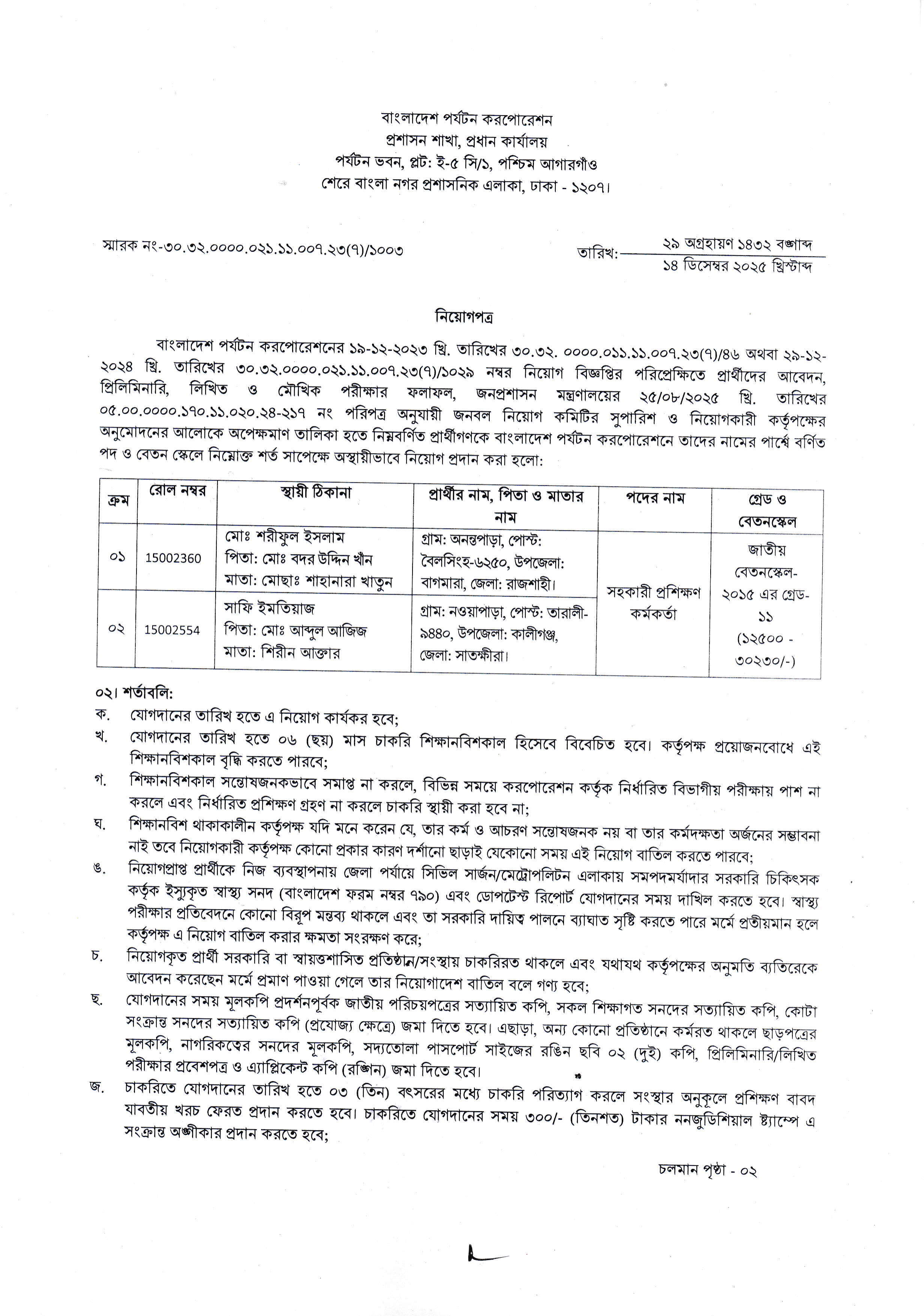 বাংলাদেশ পর্যটন করপোরেশনের অপেক্ষমাণ তালিকা থেকে সহকারী প্রশিক্ষণ কর্মকর্তা পদে ২ (দুই) জন প্রার্থীকে অস্থায়ীভাবে নিয়োগ প্রদান করা হয়েছে। এই নিয়োগ যোগদানের তারিখ থেকে কার্যকর হবে এবং ০৬ (ছয়) মাস শিক্ষানবিশকাল হিসেবে বিবেচিত হবে।
