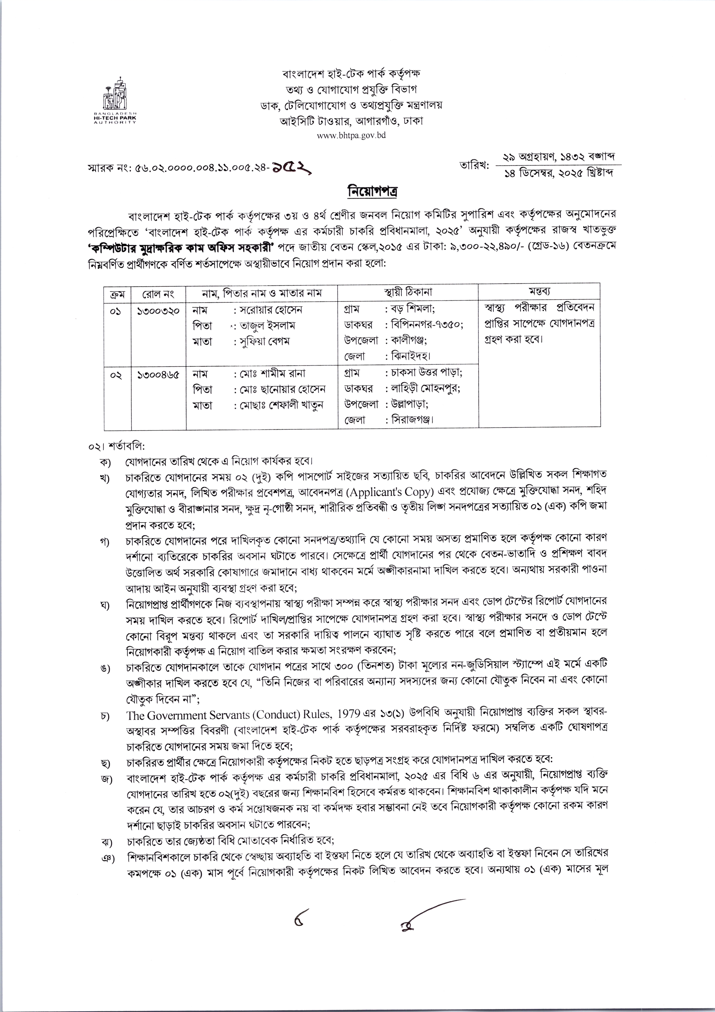 বাংলাদেশ হাই-টেক পার্ক কর্তৃপক্ষের কম্পিউটার মুদ্রাক্ষরিক কাম অফিস সহকারী পদে ২ জন প্রার্থীকে অস্থায়ীভাবে নিয়োগ প্রদান করা হয়েছে। নিয়োগপ্রাপ্তগণ জাতীয় বেতন স্কেল,২০১৫ এর টাকা: ৯,৩০০-২২৪৯০/- (গ্রেড-১৬) অনুযায়ী বেতন পাবেন।