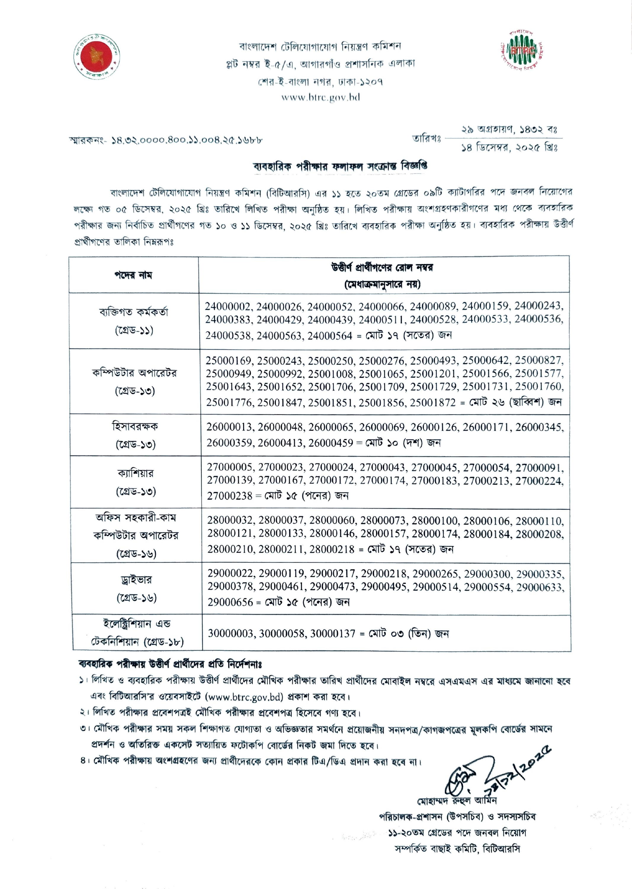 বাংলাদেশ টেলিযোগাযোগ নিয়ন্ত্রণ কমিশন (বিটিআরসি) এর ১১ হতে ২০তম গ্রেডের ০৯টি ক্যাটাগরির পদে জনবল নিয়োগের লক্ষ্যে অনুষ্ঠিত ব্যবহারিক পরীক্ষার ফলাফল প্রকাশ করা হয়েছে। গত ০৫ ডিসেম্বর, ২০২৫ তারিখে লিখিত পরীক্ষা এবং গত ১০ ও ১১ ডিসেম্বর, ২০২৫ তারিখে ব্যবহারিক পরীক্ষা অনুষ্ঠিত হয়।