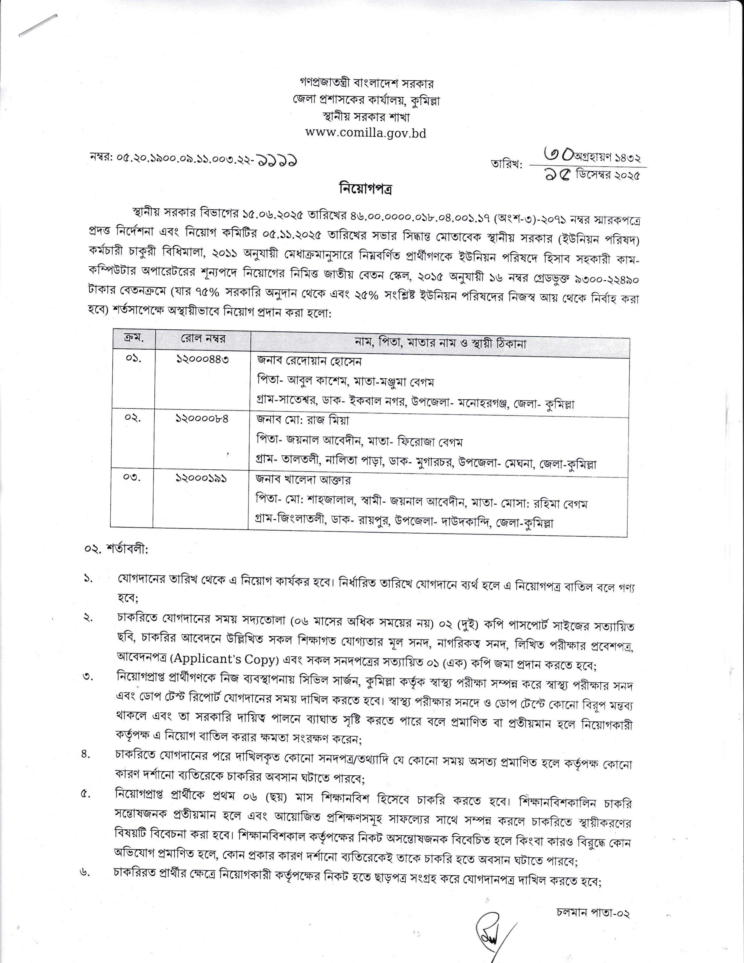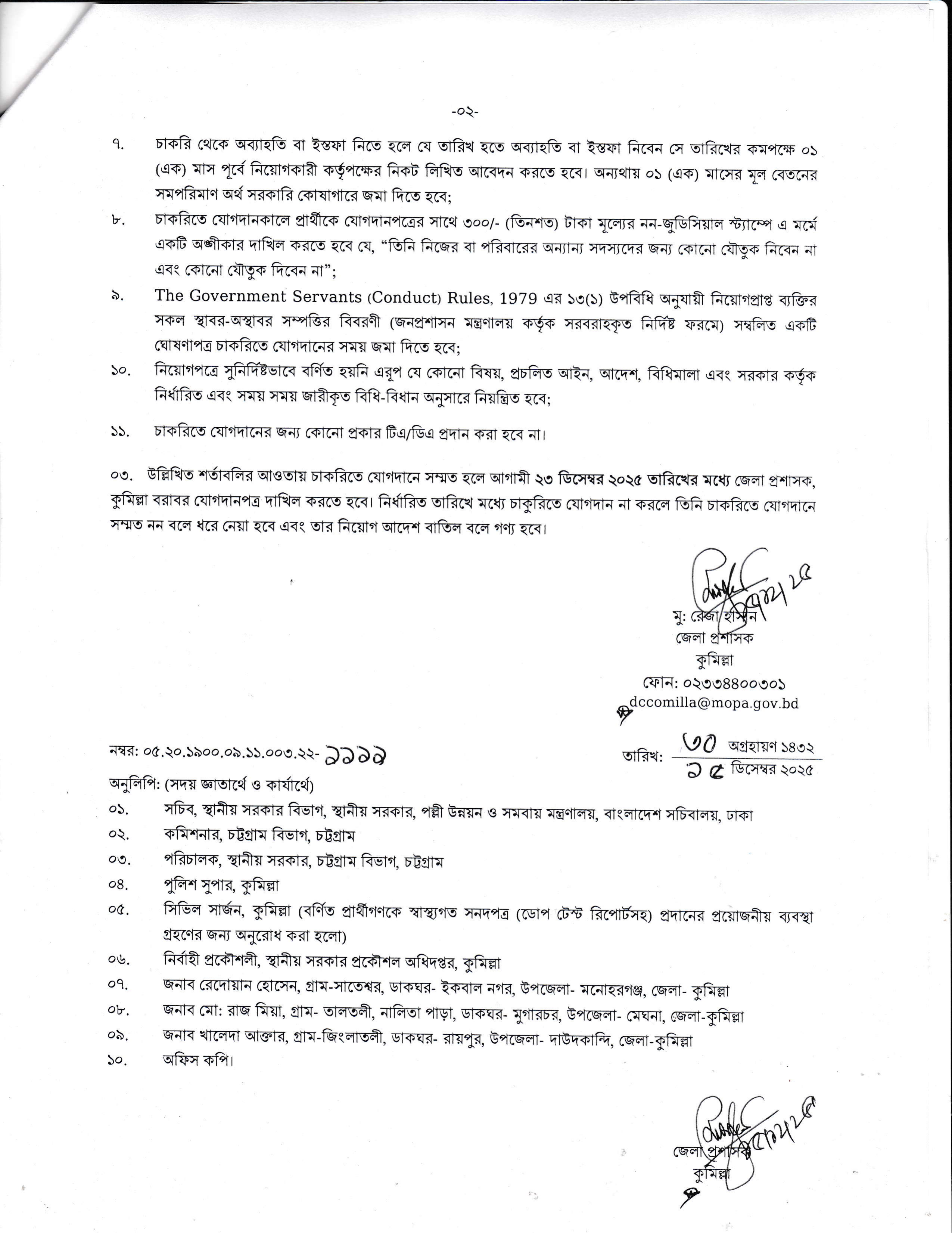 যোগদানের শেষ তারিখ: নিয়োগপ্রাপ্ত প্রার্থীগণকে আগামী ২৩ ডিসেম্বর ২০২৫ তারিখের মধ্যে জেলা প্রশাসক, কুমিল্লা বরাবর যোগদানপত্র দাখিল করতে হবে। নির্ধারিত তারিখে যোগদানে ব্যর্থ হলে নিয়োগপত্র বাতিল বলে গণ্য হবে।