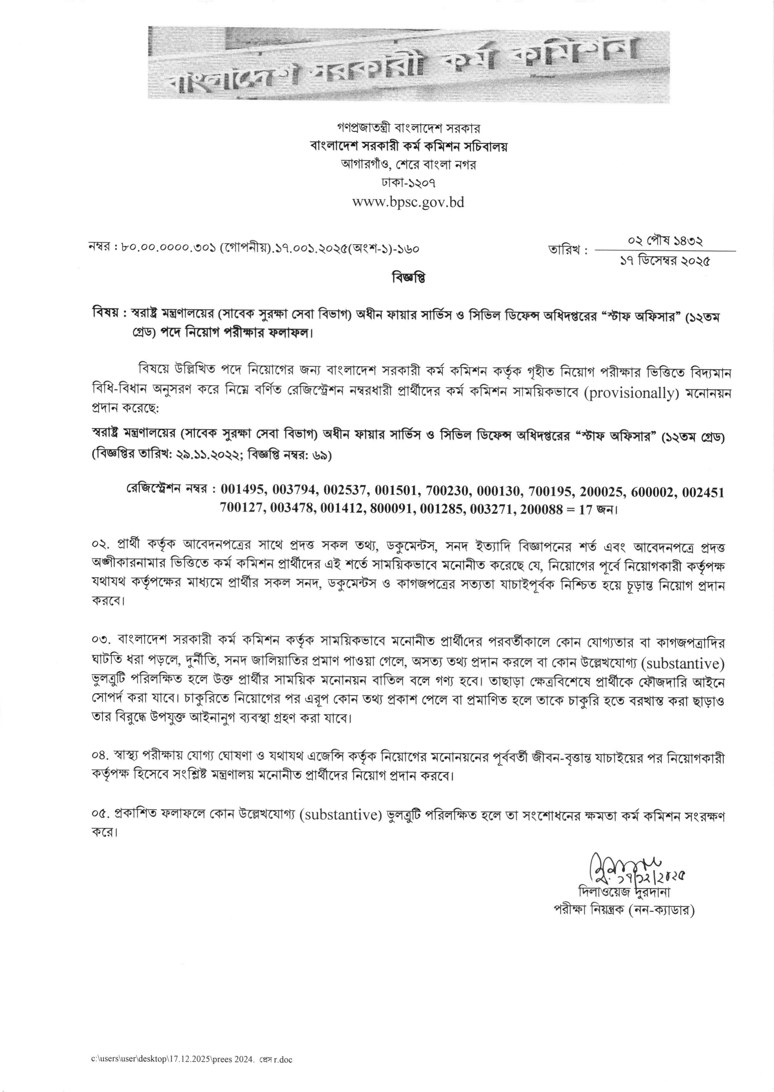 বাংলাদেশ সরকারী কর্ম কমিশন (BPSC) স্বরাষ্ট্র মন্ত্রণালয়ের (সাবেক সুরক্ষা সেবা বিভাগ) অধীন ফায়ার সার্ভিস ও সিভিল ডিফেন্স অধিদপ্তরের “স্টাফ অফিসার” (১২তম গ্রেড) পদে নিয়োগ পরীক্ষার ফলাফল প্রকাশ করেছে।