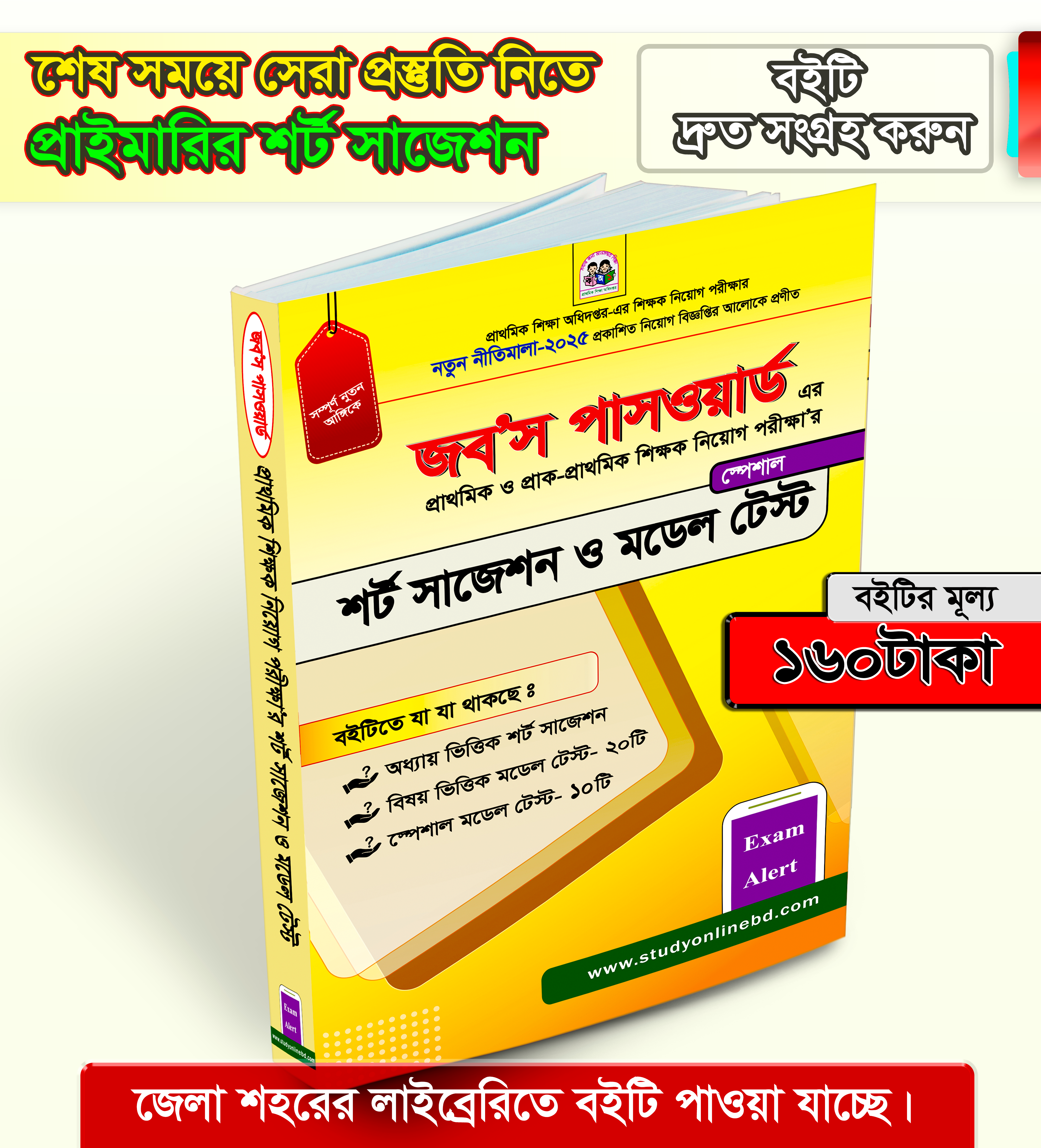 লগঃ প্রাথমিক শিক্ষক নিয়োগ পরীক্ষায় ২০২৪ এবং ২০২২ সালে ১ মার্ক কমন ছিল। ২০২২ সালে জব’স পাসওয়ার্ড এর প্রাথমিক শিক্ষক নিয়োগ পরীক্ষার শর্ট সাজেশন ও মডেল টেস্ট বই থেকে ১ টার মধ্যে ১টা প্রশ্ন কমন ছিল । ২০২৪ সালে কমন ছিল না