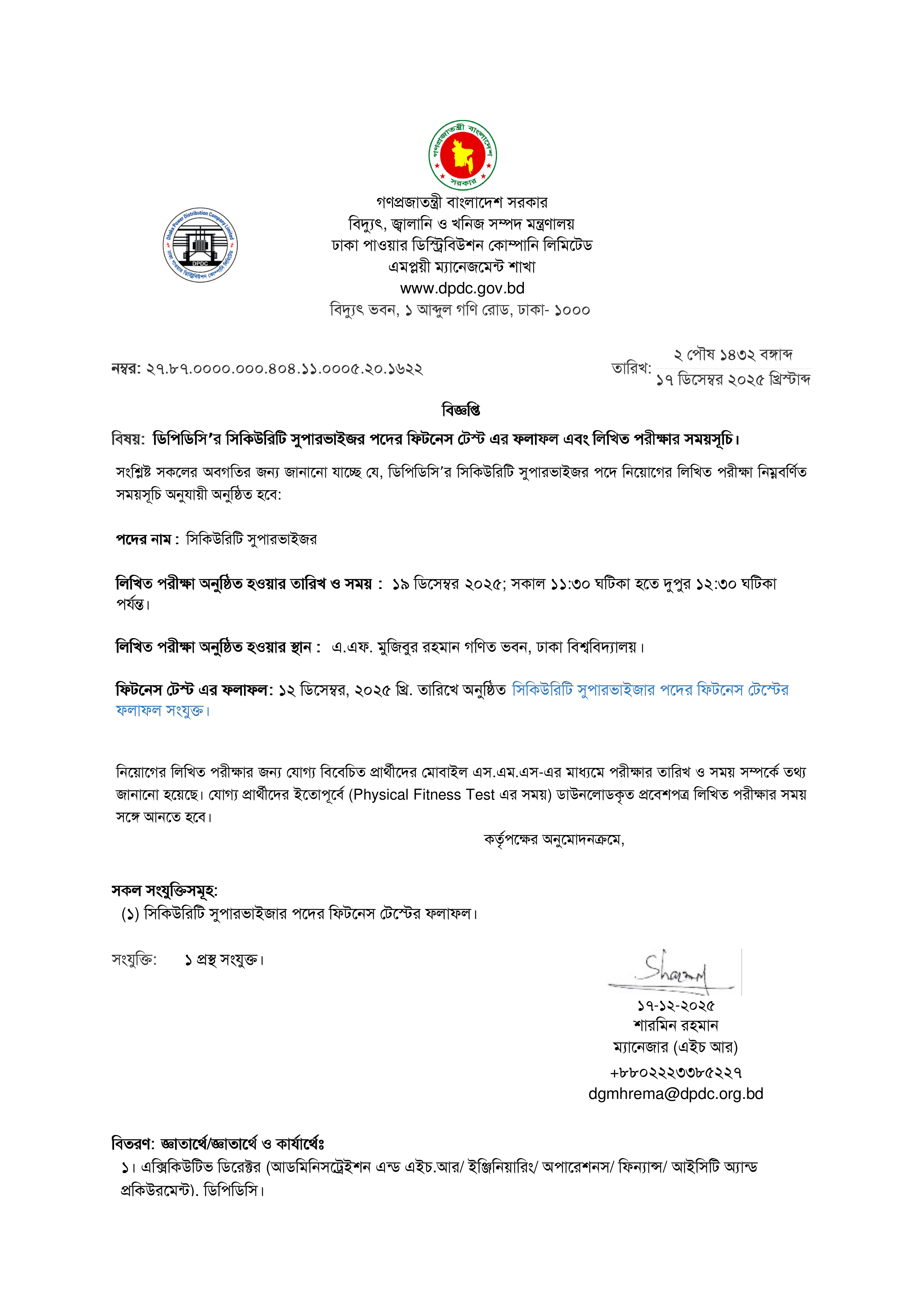 ঢাকা পাওয়ার ডিস্ট্রিবিউশন কোম্পানি লিমিটেড (ডিপিডিসি) এর সিকিউরিটি সুপারভাইজর পদের ফিটনেস টেস্টের ফলাফল প্রকাশ করা হয়েছে। গত ১২ ডিসেম্বর, ২০২৫ তারিখে অনুষ্ঠিত ফিটনেস টেস্টে মোট ১৭৭ জন প্রার্থী লিখিত পরীক্ষার জন্য যোগ্য বিবেচিত হয়েছেন।
