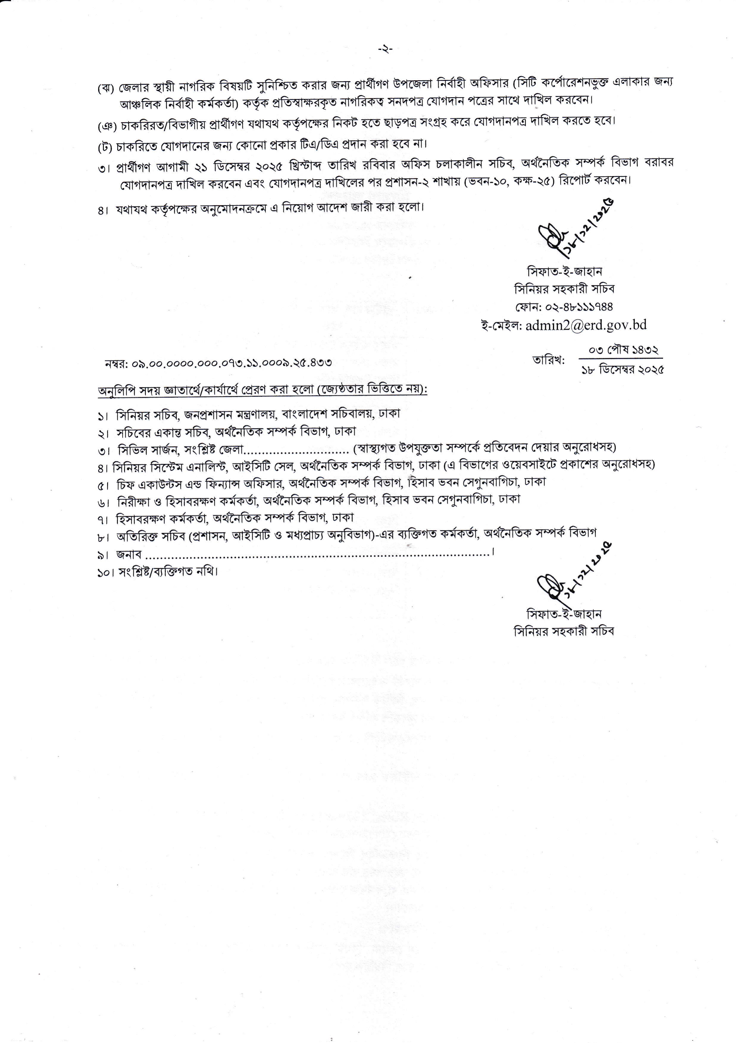 নিয়োগপ্রাপ্ত প্রার্থীদের আগামী ২১ ডিসেম্বর ২০২৫ খ্রিস্টাব্দ তারিখ রবিবার অফিস চলাকালীন সময়ে সচিব, অর্থনৈতিক সম্পর্ক বিভাগ বরাবর যোগদানপত্র দাখিল করতে বলা হয়েছে।