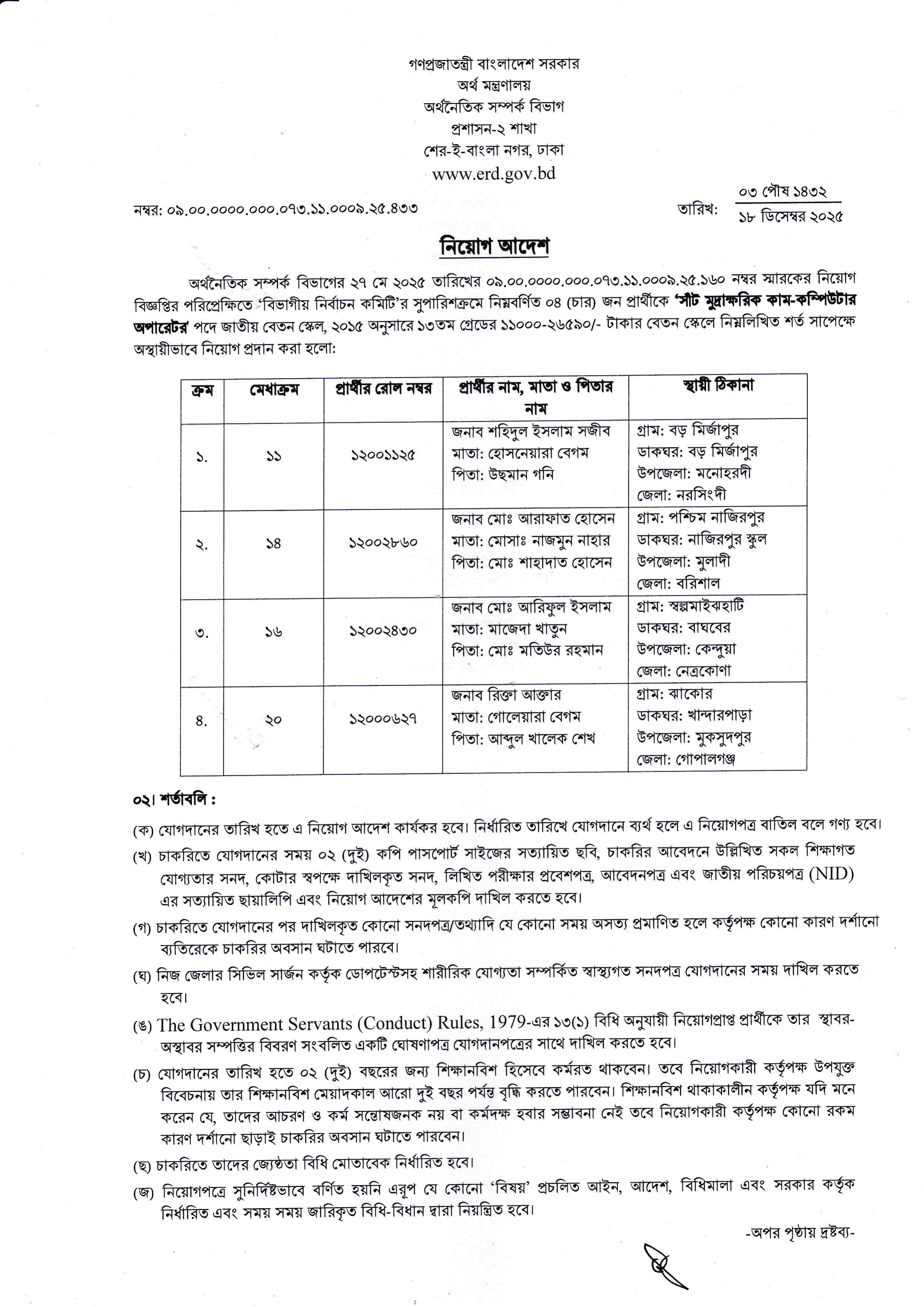 অর্থ মন্ত্রণালয়ের অর্থনৈতিক সম্পর্ক বিভাগ কর্তৃক "সাঁট মুদ্রাক্ষরিক কাম-কম্পিউটার অপারেটর" পদে ০৪ (চার) জন প্রার্থীর নিয়োগ আদেশ জারি করা হয়েছে।