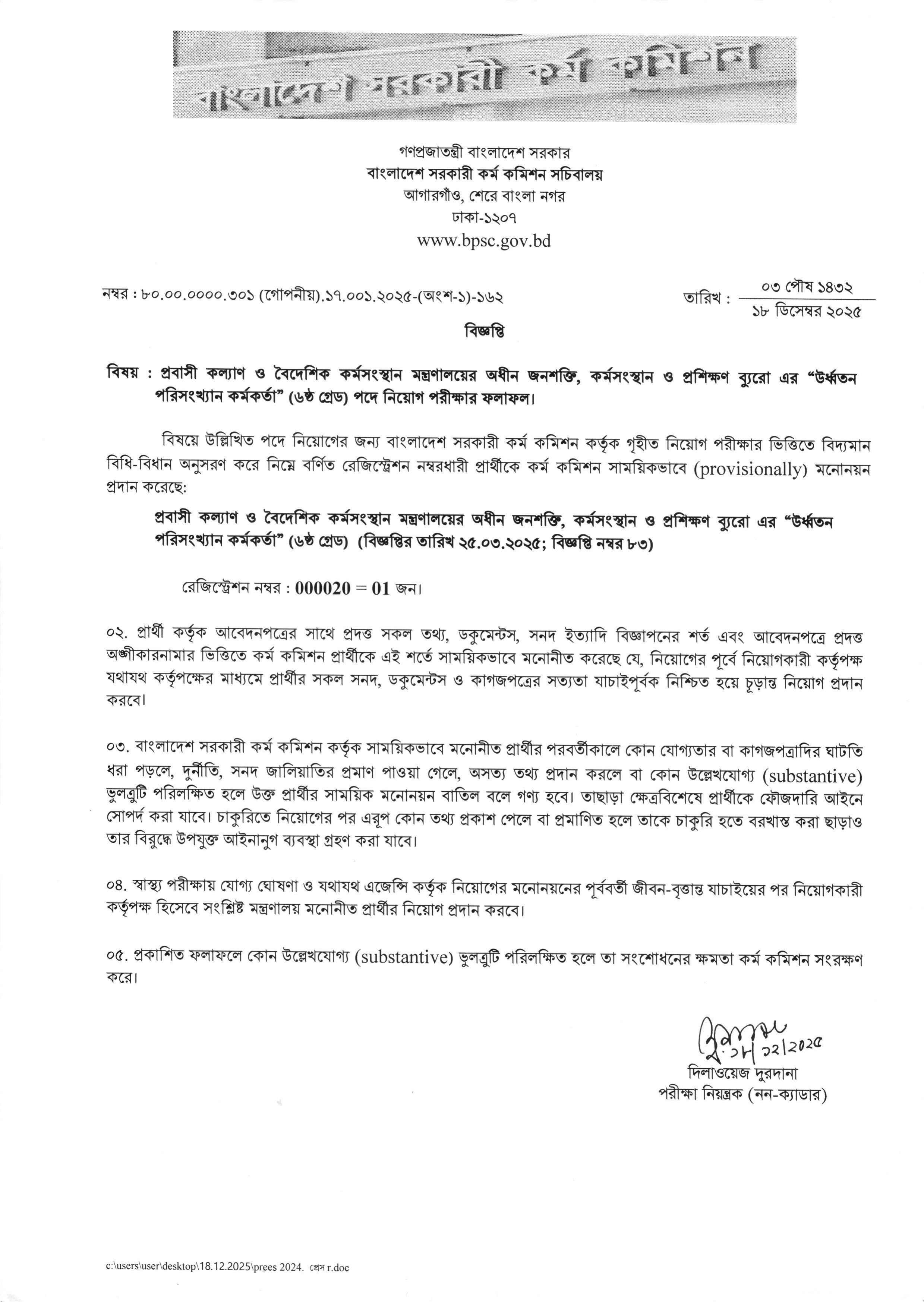 বাংলাদেশ সরকারী কর্ম কমিশন (BPSC) প্রবাসী কল্যাণ ও বৈদেশিক কর্মসংস্থান মন্ত্রণালয়ের অধীন জনশক্তি, কর্মসংস্থান ও প্রশিক্ষণ ব্যুরো এর “উর্ধতন পরিসংখ্যান কর্মকর্তা” (৬ষ্ঠ গ্রেড) পদে নিয়োগ পরীক্ষার ফলাফল প্রকাশ করেছে।
