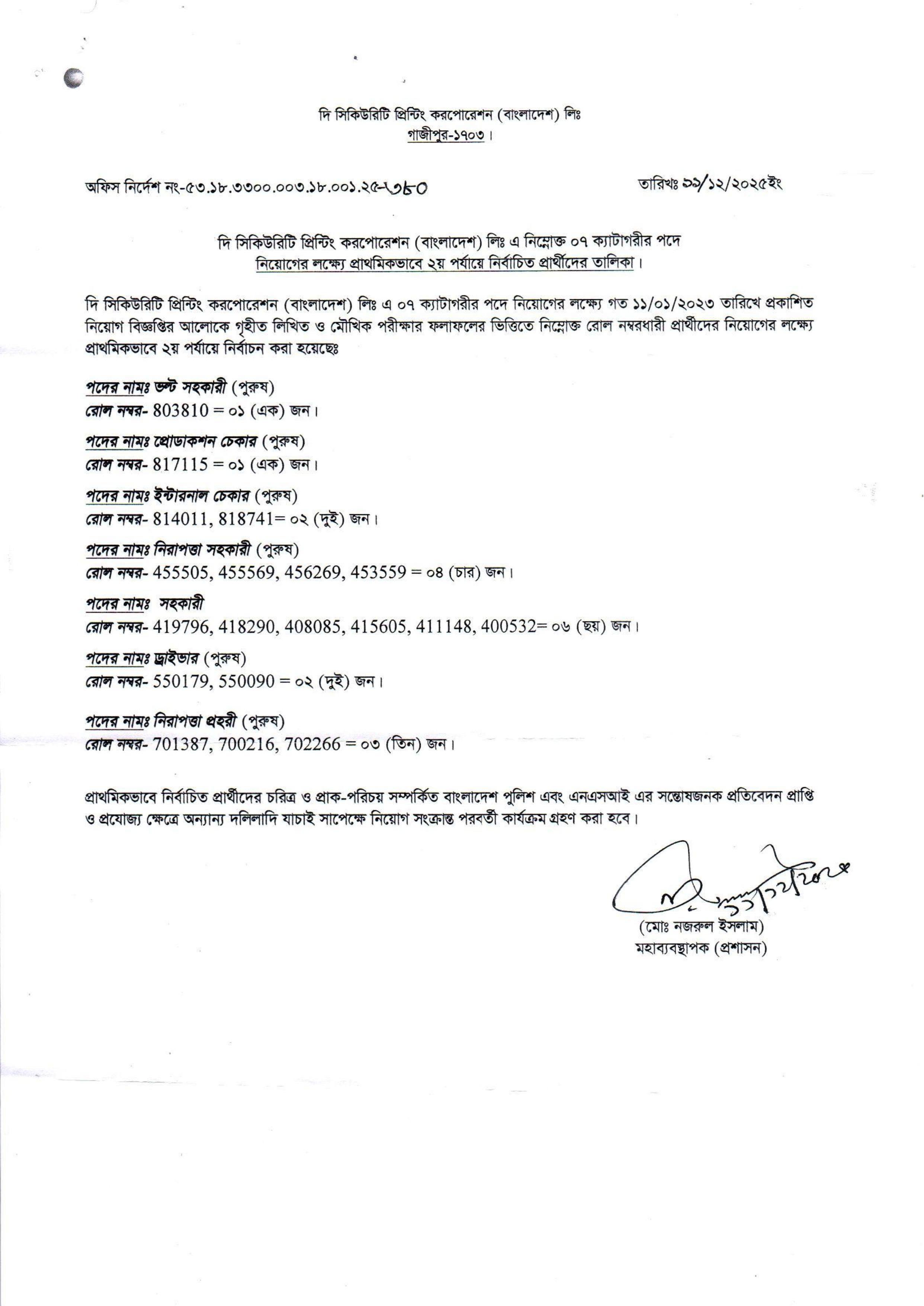 দি সিকিউরিটি প্রিন্টিং করপোরেশন (বাংলাদেশ) লিঃ এর ০৭ ক্যাটাগরীর পদে নিয়োগের লক্ষ্যে ২য় পর্যায়ে প্রাথমিকভাবে নির্বাচিত প্রার্থীদের তালিকা প্রকাশ করা হয়েছে।