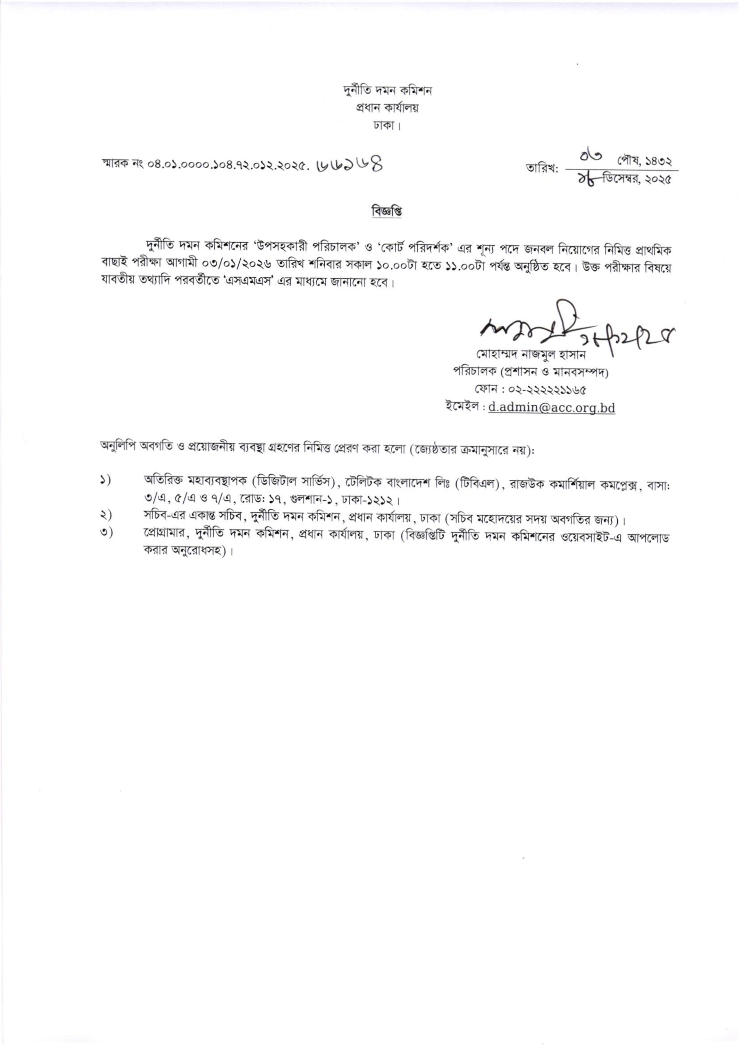 দুর্নীতি দমন কমিশন (দুদক) এর “উপসহকারী পরিচালক” ও “কোর্ট পরিদর্শক” শূন্য পদের জনবল নিয়োগের নিমিত্ত প্রাথমিক বাছাই পরীক্ষার সময়সূচী প্রকাশ করা হয়েছে।