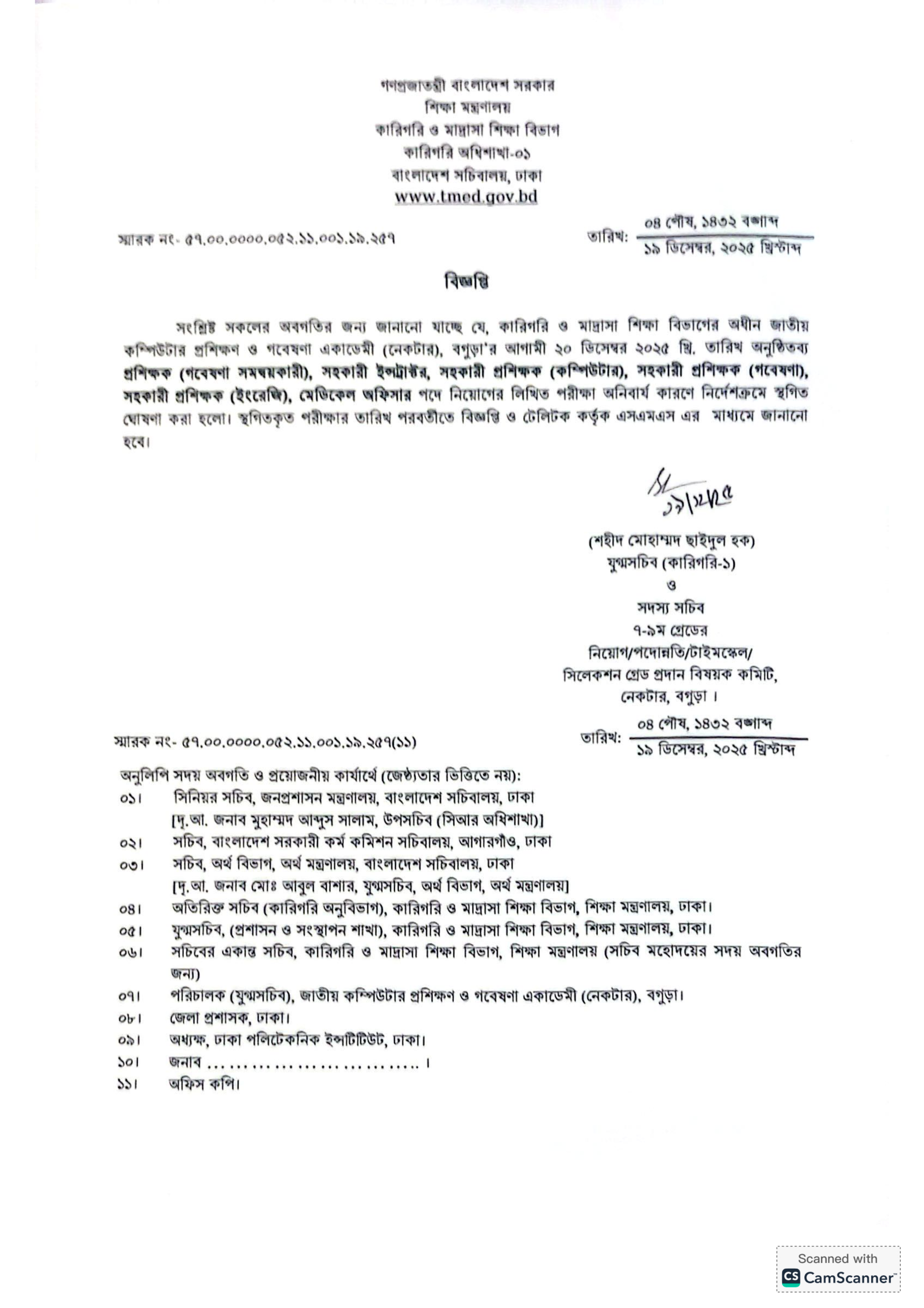 এতদ্বারা সংশ্লিষ্ট সকলের অবগতির জন্য জানানো যাচ্ছে যে, কারিগরি ও মাদ্রাসা শিক্ষা বিভাগের অধীন জাতীয় কম্পিউটার প্রশিক্ষণ ও গবেষণা একাডেমী (নেকটার), বগুড়া-র আগামী ২০ ডিসেম্বর ২০২৫ খ্রি. তারিখে অনুষ্ঠিতব্য বিভিন্ন পদের নিয়োগের লিখিত পরীক্ষা অনিবার্য কারণবশত স্থগিত করা হয়েছে ।