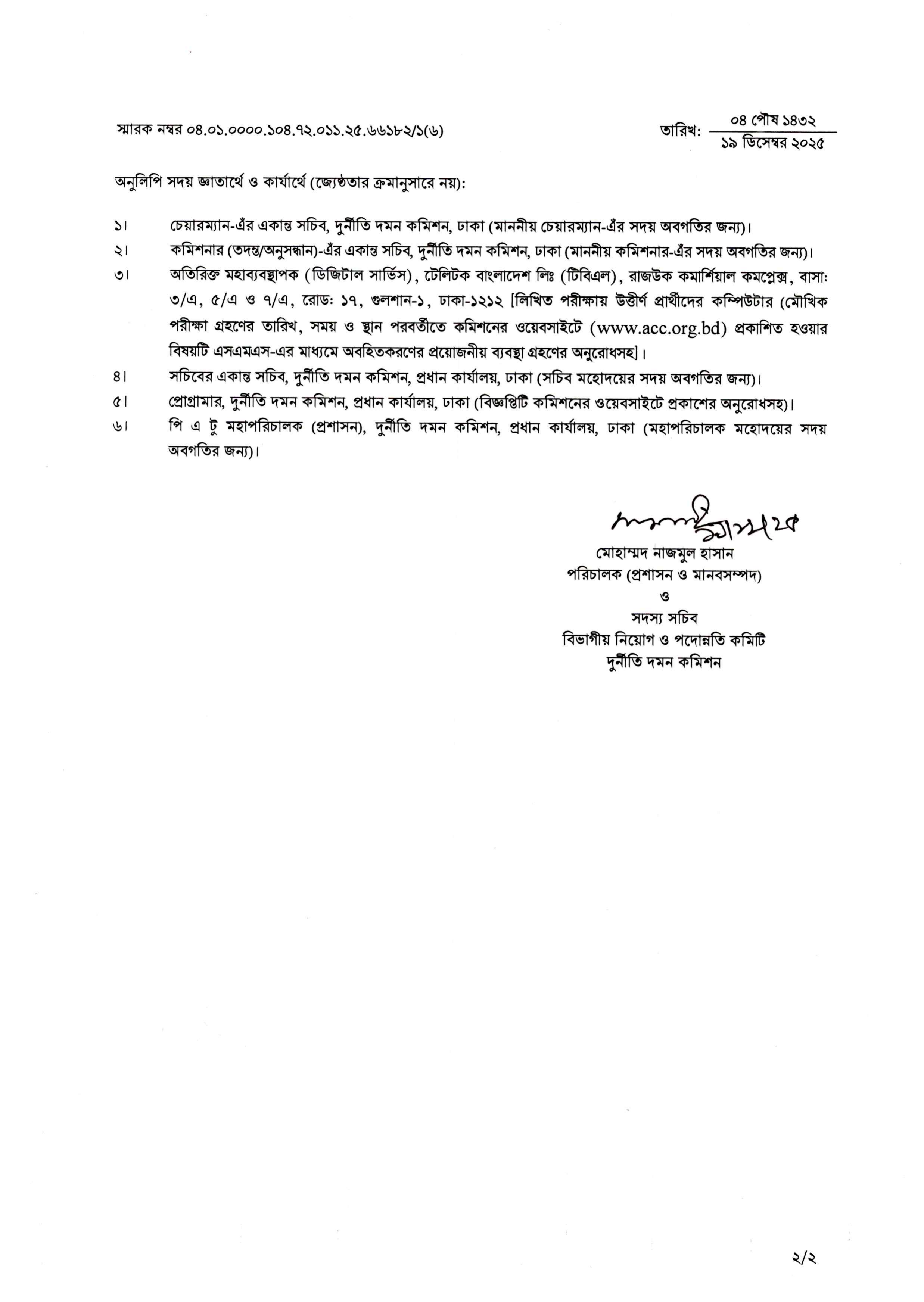 লিখিত ও ব্যবহারিক পরীক্ষায় উত্তীর্ণ প্রার্থীদের মৌখিক পরীক্ষার সময়সূচি এবং স্থান পরবর্তীতে দুর্নীতি দমন কমিশনের নিজস্ব ওয়েবসাইটে প্রকাশ করা হবে। এছাড়া উত্তীর্ণ প্রার্থীদের টেলিটকের মাধ্যমে এসএমএস দিয়েও পরীক্ষার তারিখ ও সময় জানিয়ে দেওয়া হবে।