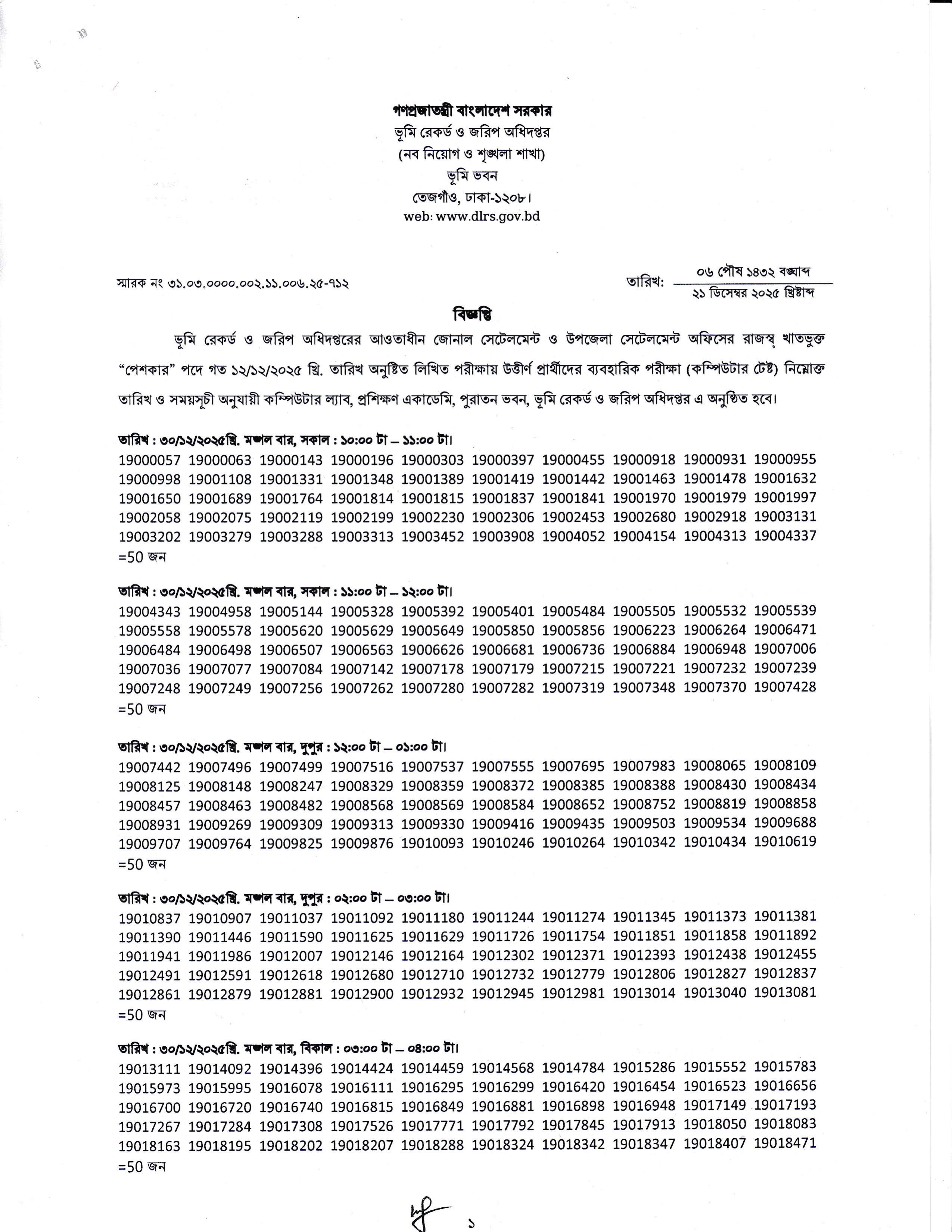 পরীক্ষার স্থান: কম্পিউটার ল্যাব, প্রশিক্ষণ একাডেমি, পুরাতন ভবন, ভূমি রেকর্ড ও জরিপ অধিদপ্তর, তেজগাঁও, ঢাকা-১২০৮।