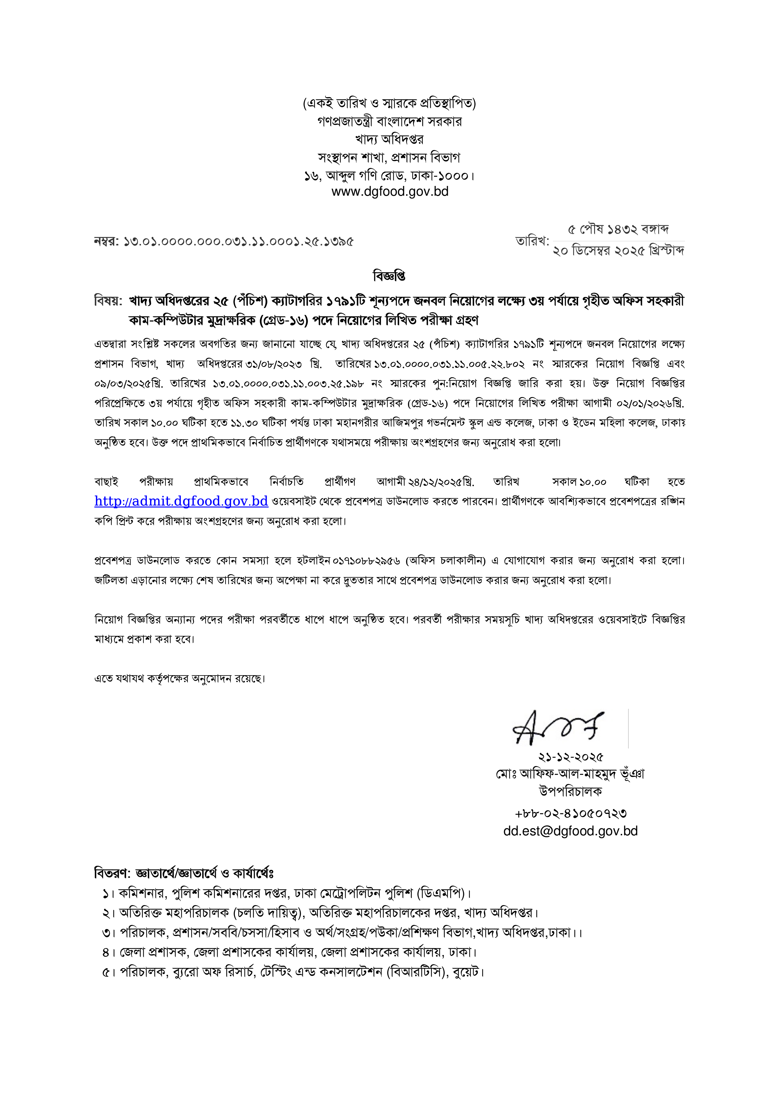 প্রবেশপত্র ডাউনলোড সংক্রান্ত তথ্য: পরীক্ষায় অংশগ্রহণের জন্য প্রাথমিকভাবে নির্বাচিত প্রার্থীগণ আগামী ২৪ ডিসেম্বর ২০২৫ তারিখ সকাল ১০.০০ ঘটিকা হতে নির্ধারিত ওয়েবসাইট থেকে প্রবেশপত্র ডাউনলোড করতে পারবেন। পরীক্ষার্থীদের অবশ্যই প্রবেশপত্রের রঙিন কপি প্রিন্ট করে সঙ্গে আনতে হবে।