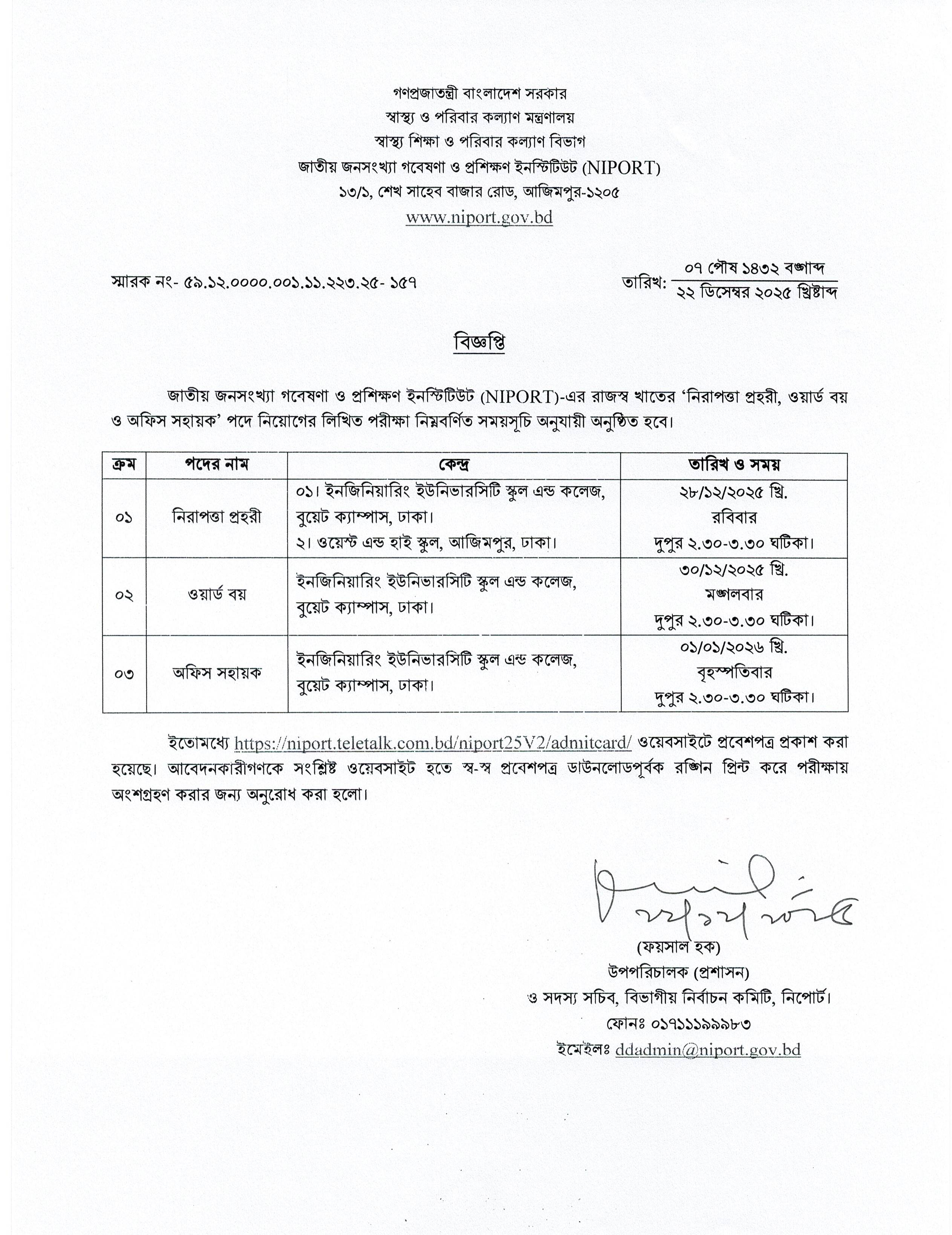 প্রবেশপত্র সংগ্রহ: আবেদনকারীগণকে https://niport.teletalk.com.bd ওয়েবসাইট থেকে স্ব-স্ব প্রবেশপত্র ডাউনলোড করে রঙিন প্রিন্ট কপি পরীক্ষার সময় সাথে আনতে হবে।