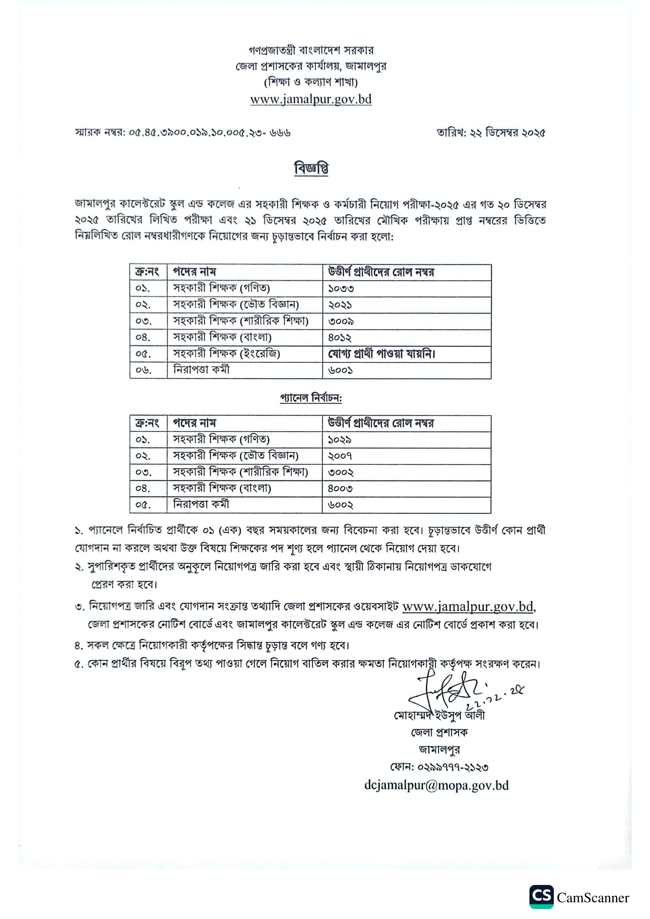 জামালপুর কালেক্টরেট স্কুল এন্ড কলেজ-এর সহকারী শিক্ষক ও কর্মচারী নিয়োগ পরীক্ষার চূড়ান্ত ফলাফল প্রকাশ করা হয়েছে। গত ২০ ডিসেম্বর ২০২৫ তারিখে অনুষ্ঠিত লিখিত পরীক্ষা এবং ২১ ডিসেম্বর ২০২৫ তারিখে অনুষ্ঠিত মৌখিক পরীক্ষায় প্রাপ্ত নম্বরের ভিত্তিতে প্রার্থীদের চূড়ান্তভাবে নির্বাচন করা হয়েছে।