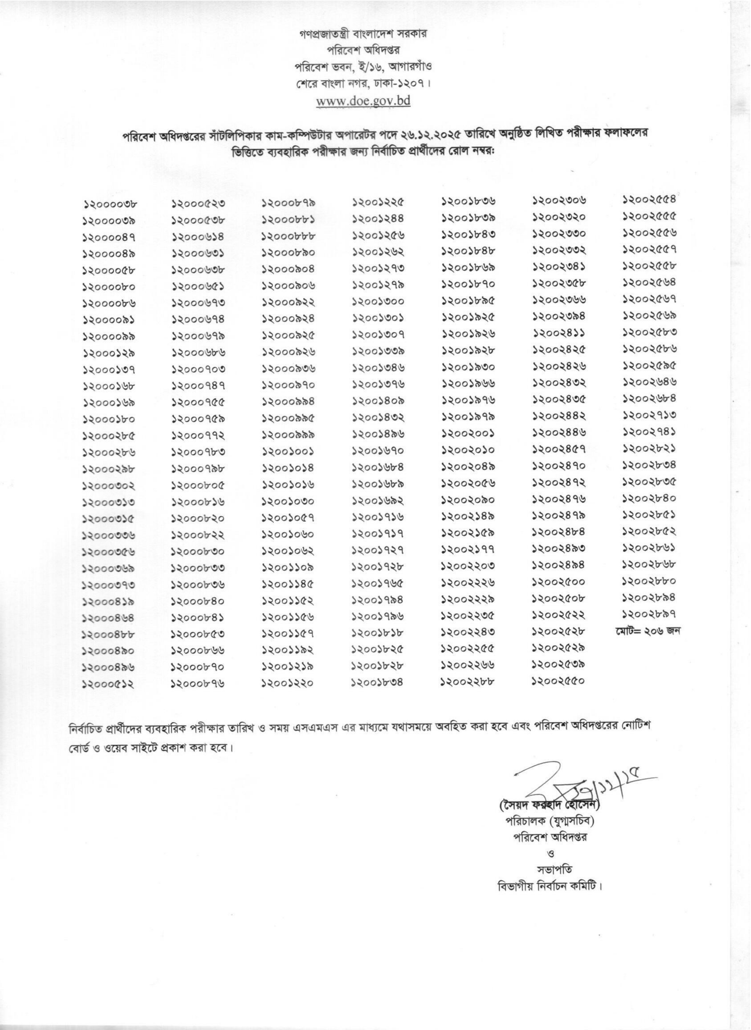 ব্যবহারিক পরীক্ষার সময়সূচী: নির্বাচিত প্রার্থীদের ব্যবহারিক পরীক্ষার তারিখ, সময় ও স্থান পরবর্তীতে এসএমএস (SMS)-এর মাধ্যমে জানিয়ে দেওয়া হবে। এছাড়া পরিবেশ অধিদপ্তরের নোটিশ বোর্ড এবং অফিসিয়াল ওয়েবসাইটেও এই তথ্য প্রকাশ করা হবে।