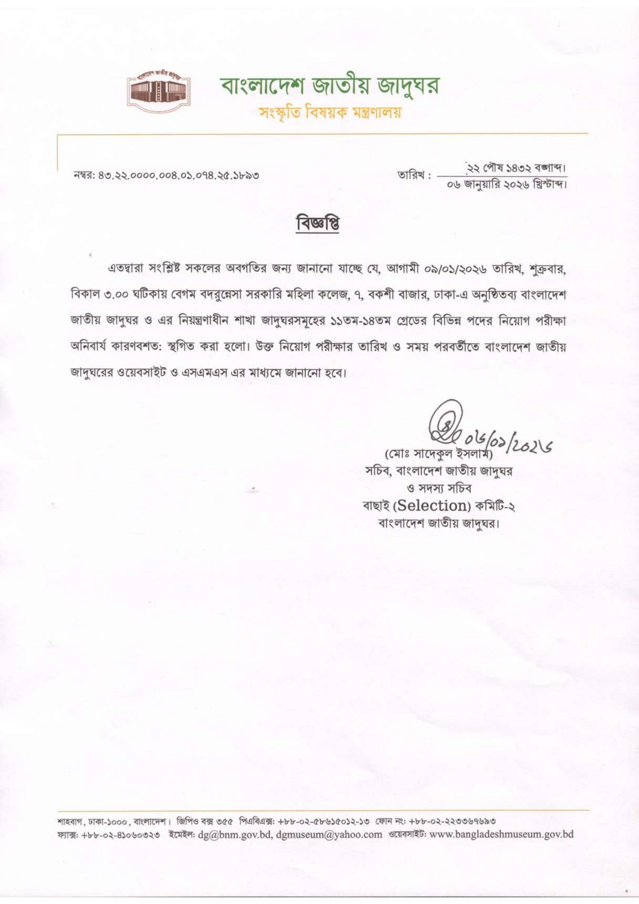স্থগিত হওয়া নিয়োগ পরীক্ষার নতুন তারিখ ও সময় পরবর্তীতে বাংলাদেশ জাতীয় জাদুঘরের অফিসিয়াল ওয়েবসাইট এবং আবেদনকারীদের মোবাইল ফোনে এসএমএস (SMS) এর মাধ্যমে জানিয়ে দেওয়া হবে।
